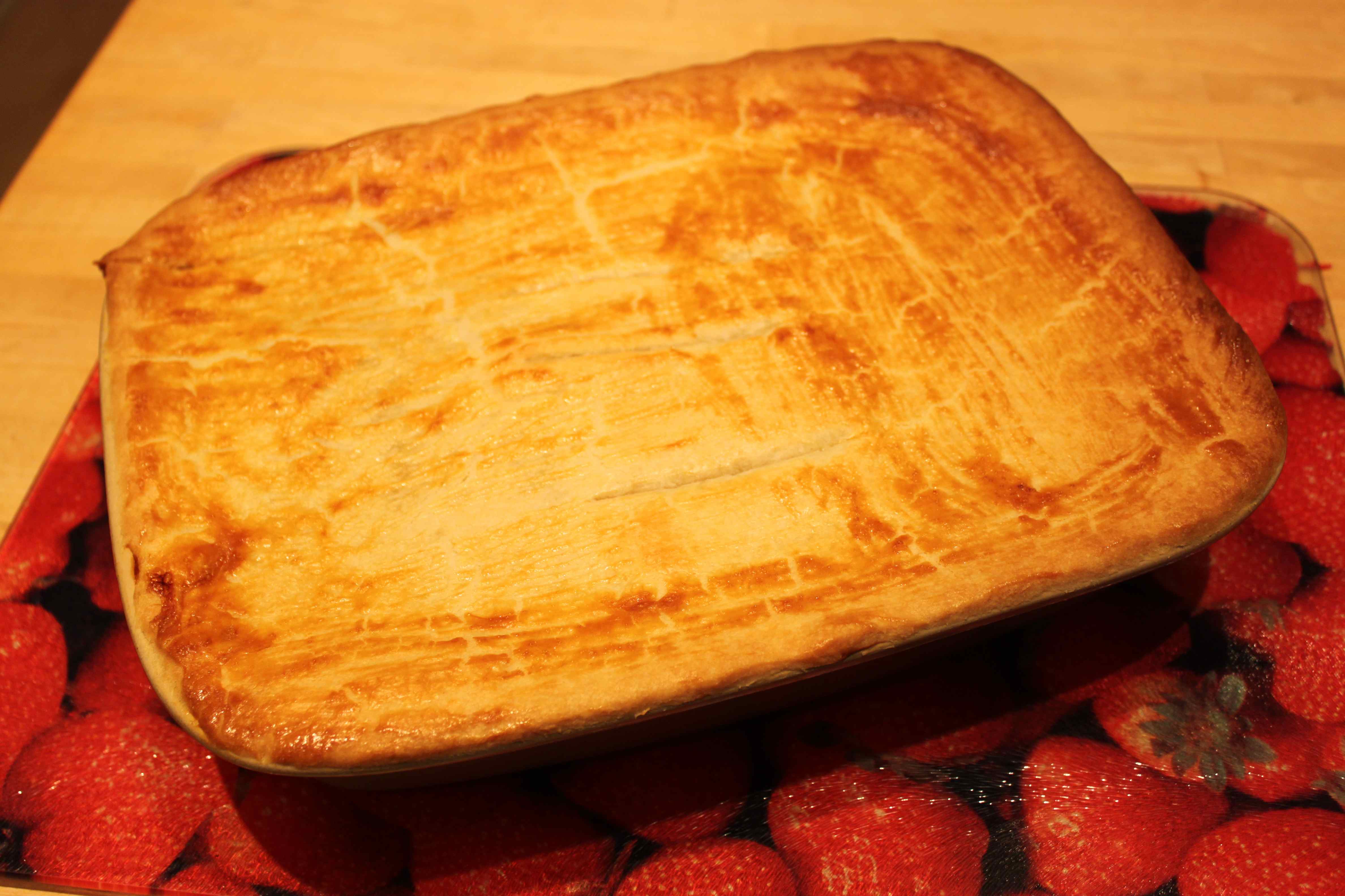 Roll out the pastry and press on to the top of the dish.