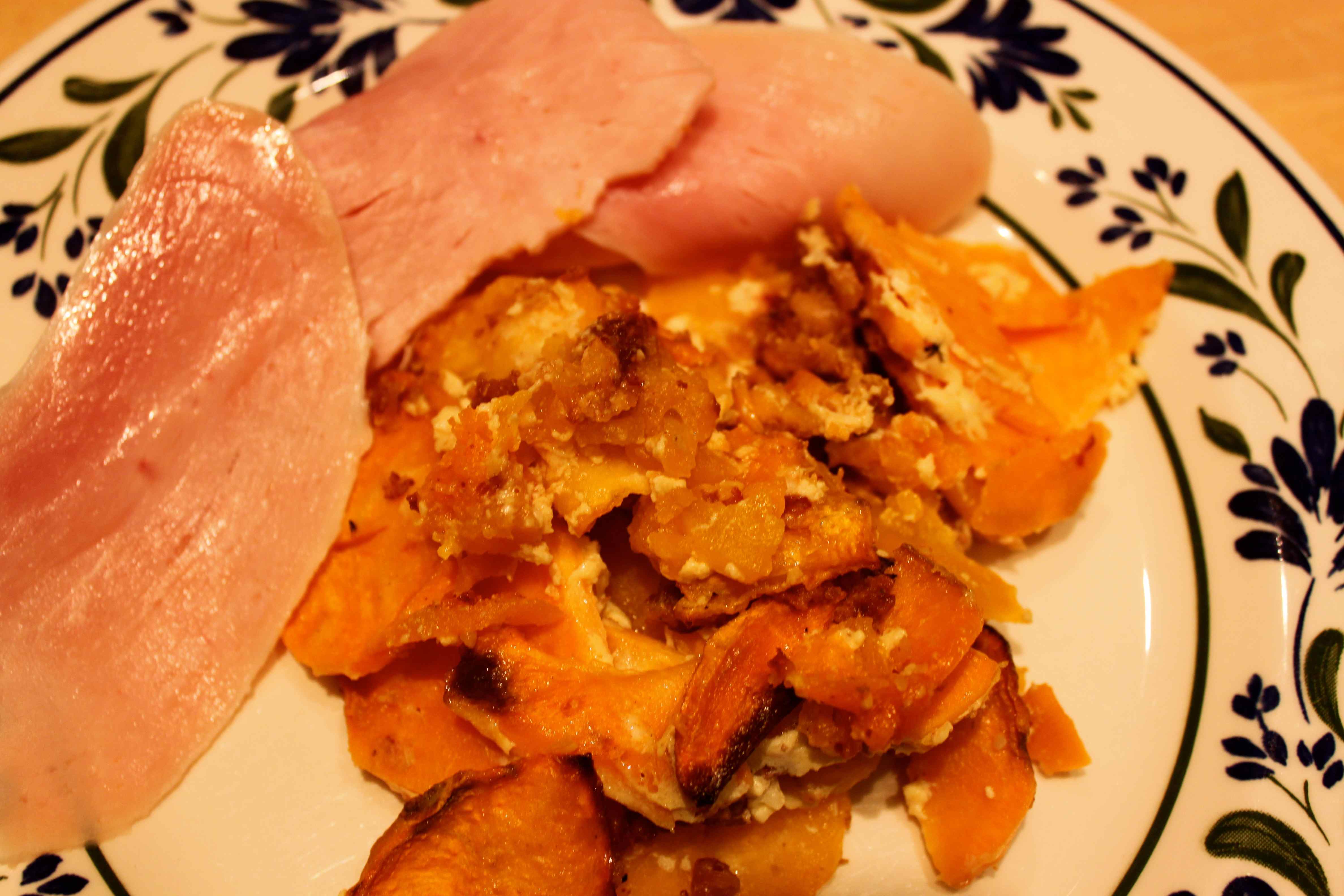 For supper I trod a well worn track to Veg Everyday! The Sweet Potato and Peanut Gratin beckoned. This dish is sweet potatoes, sliced thinly and baked in a cream and garlic sauce. So Harvey, who is dairy intolerant, could eat it, I used natural soya yogurt instead of double cream. That also saved me quite a few points. In the middle of the dish was a layer of peanut butter and lime.