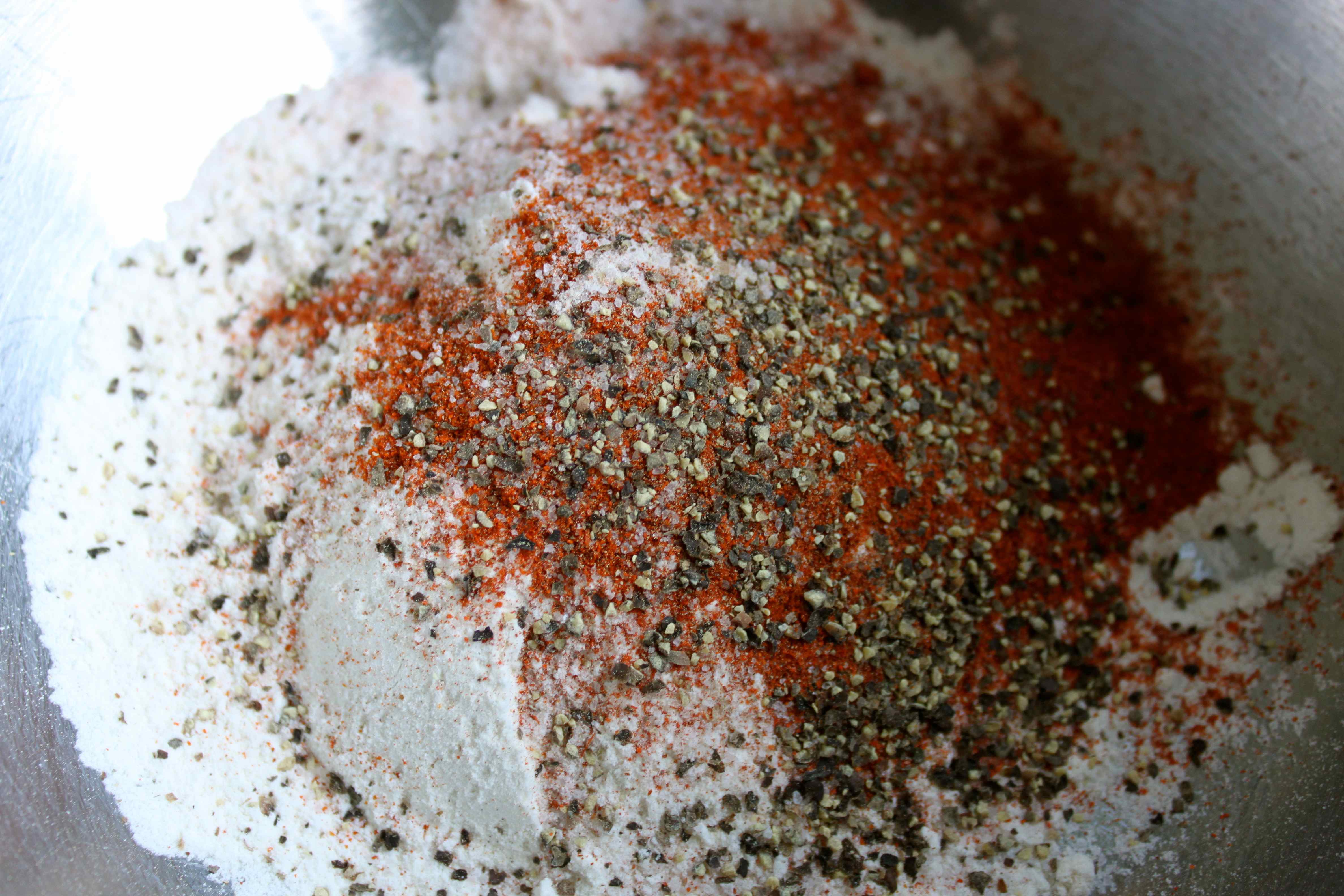 In a large bowl mix together the flour, paprika, salt and pepper.