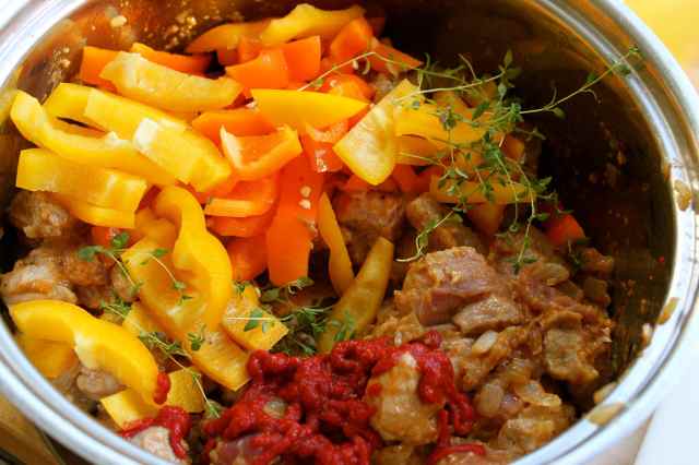 Just before serving, swirl the sour cream in to the goulash. I didn’t, because Harvey can not eat cream and I wanted to save points.