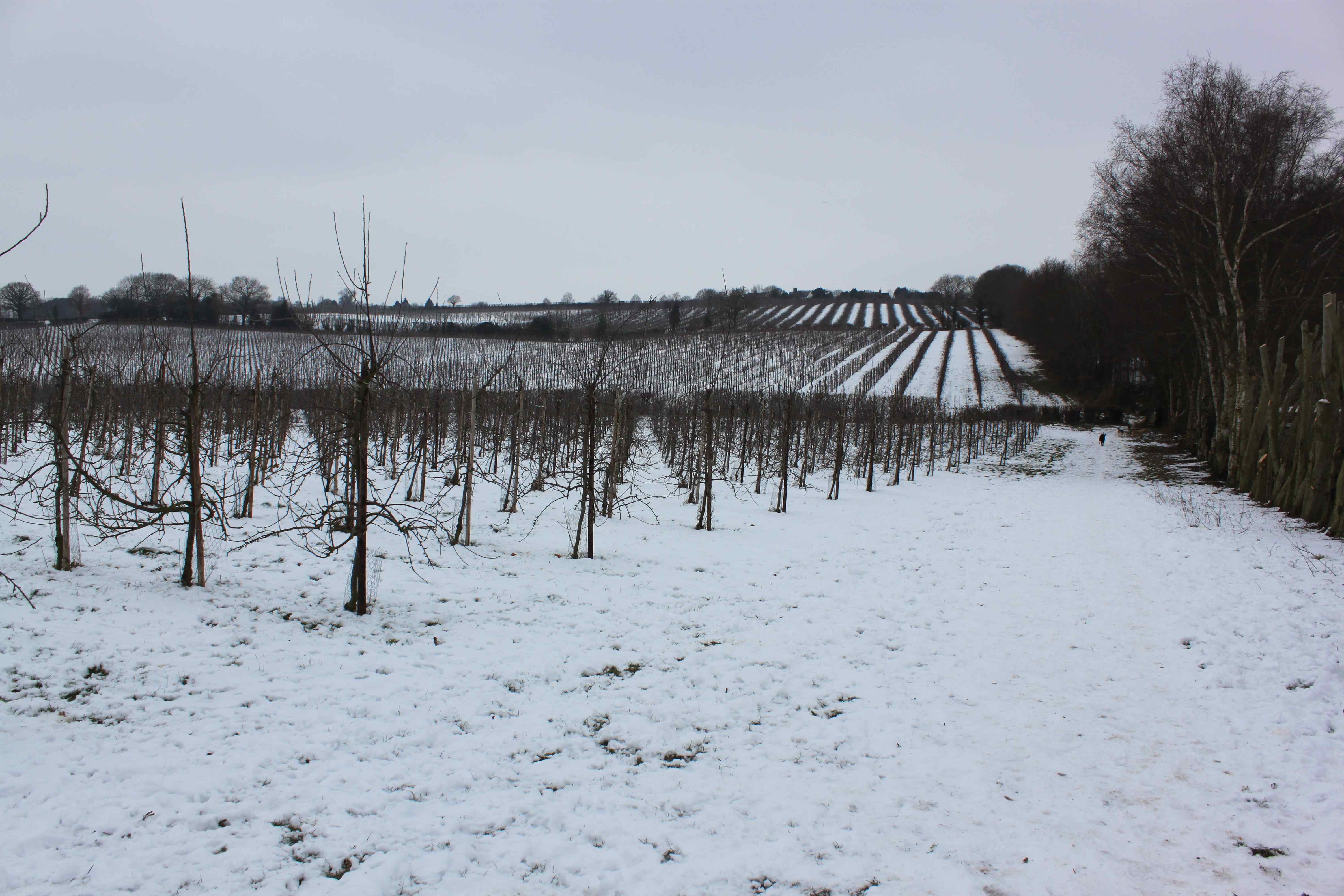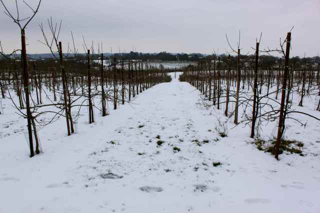 08:30 meet Lisa in the village for a walk round the snowy apple orchards :-). This snow is making my world look very black and white!