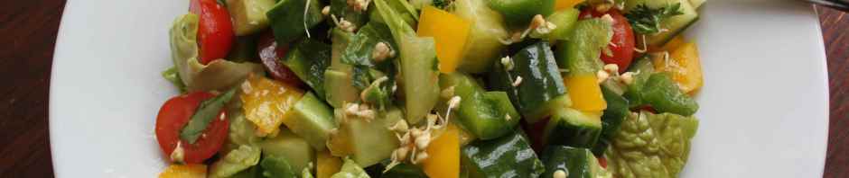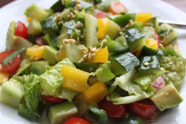 13:00 Raw Vegetable Salad, made with lettuce, cherry tomatoes, cucumber, avocado, yellow pepper, green pepper, spring onion, buckwheat sprouts and fresh herbs. I added some flax seed oil and lemon juice as a dressing. The colour has come back in to my world.