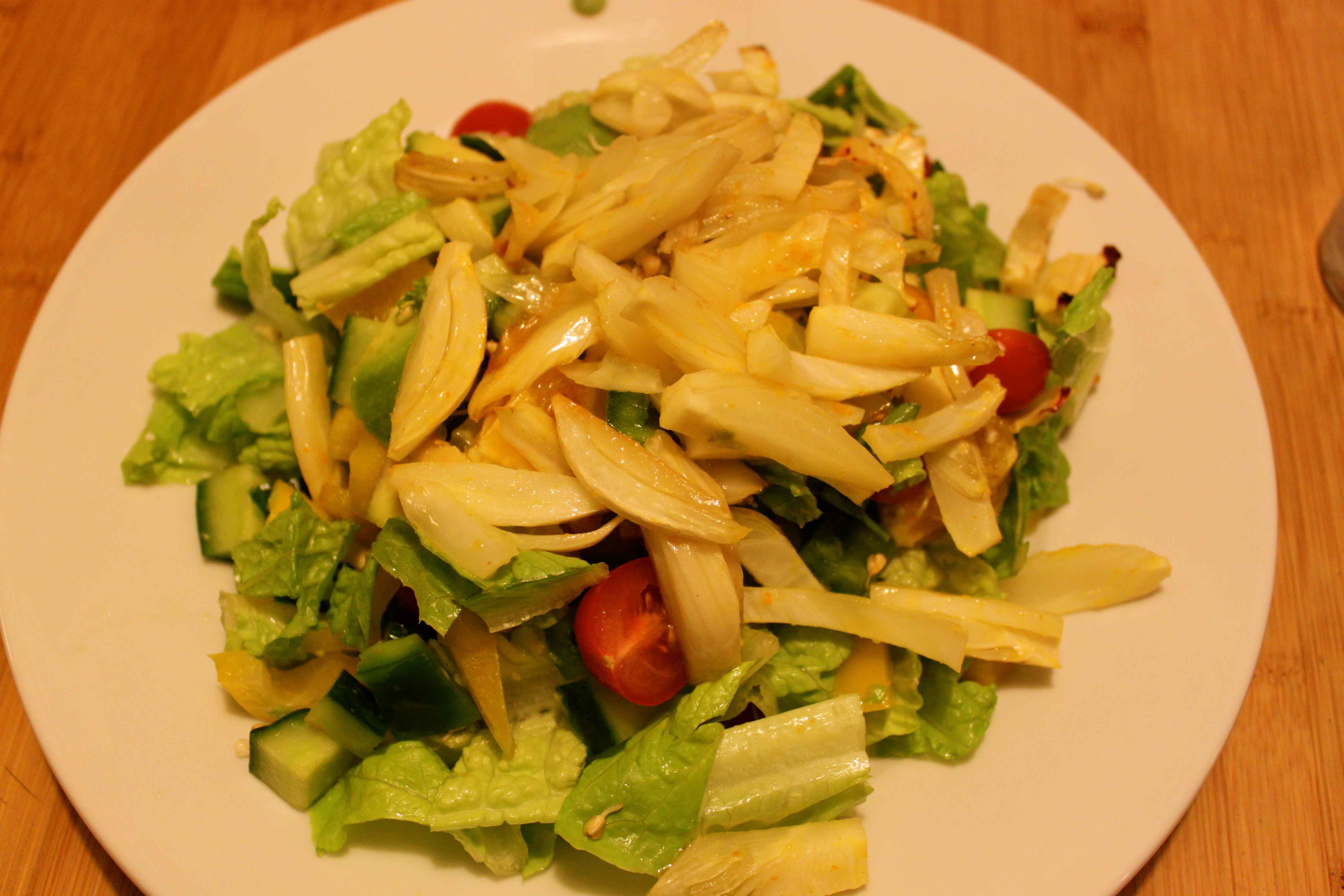 20:00 Roast Fennel salad. Finally, some cooked food!!!! I was so excited to be turning the oven on 🙂 . This was very tasty and I will make this again. You cut the fennel in to thin strips and put it in a roasting tray. Drizzle it with olive oil and the juice and zest of an orange. Roast at 170 ° C for 15 minutes and serve on top of the salad, which was the same as the one I had at lunch time, except instead of adding a dressing, I used the oil and orange juice from the roasting tray.