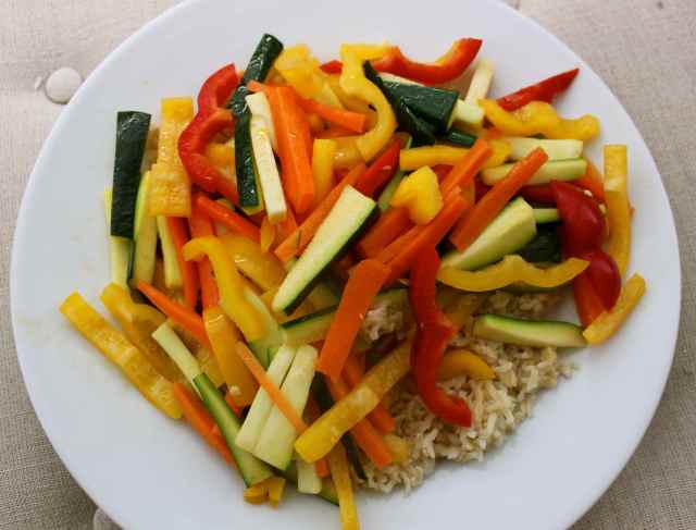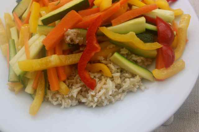 I was so excited about eating rice. I was missing eating food that was soft and warm. I also love brown rice. I think it is nurturing and comforting food. On top of the rice was some carrot, courgette, spring onion, ½ a red pepper and ½ a yellow pepper, lightly stir fried in sesame oil. I was meant to cook it with ginger, garlic and lemon grass but I did not fancy such strong flavours so I ate it plain. Just brown rice and vegetables. Yum.