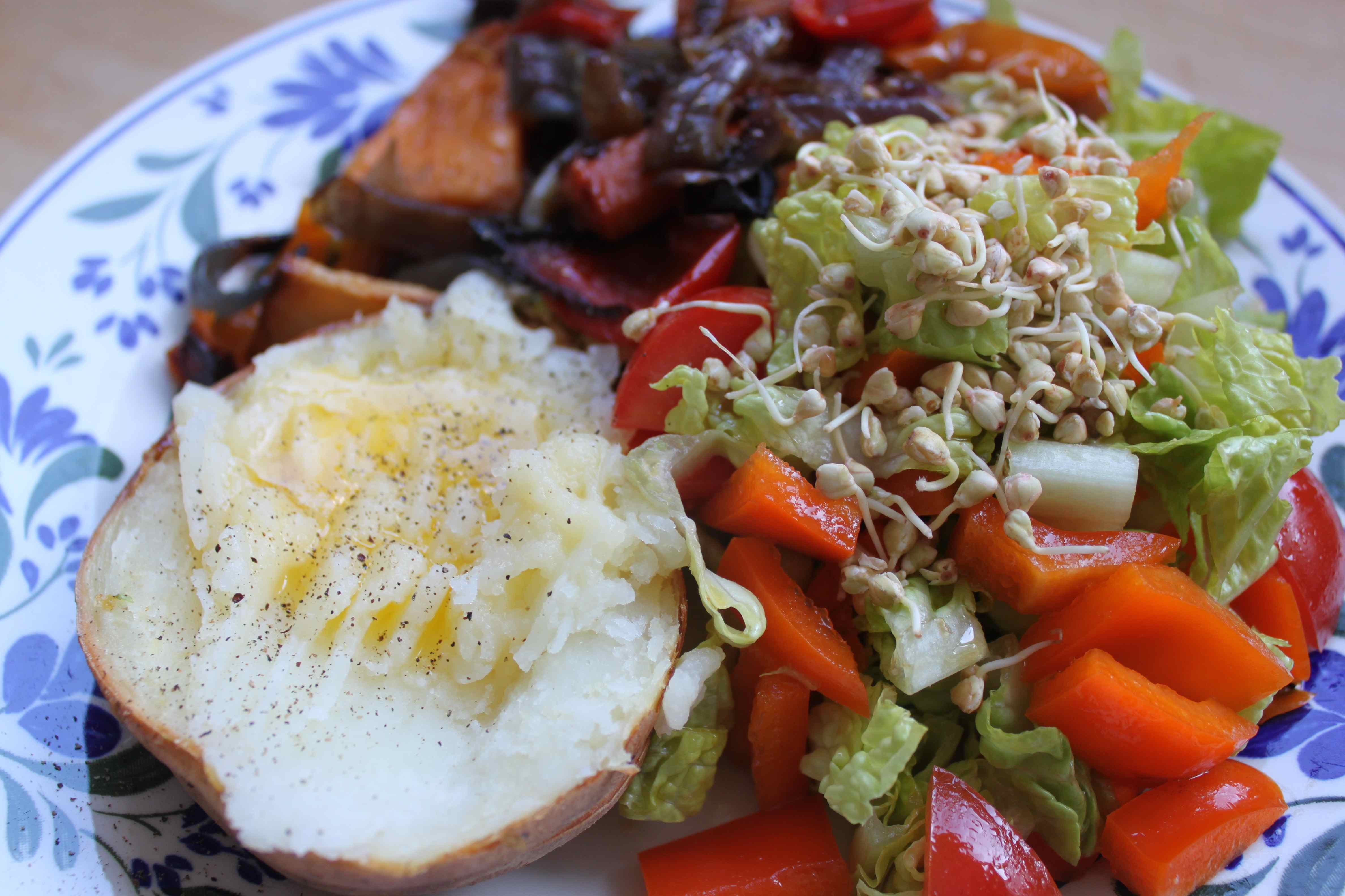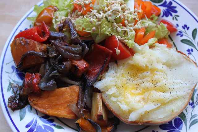 I made a salad of lettuce, orange pepper and tomatoes which I dressed with 1 tbsp olive oil and 1 tsp apple cider vinegar. I also heated up some left over roasted vegetables (parsnip, sweet potato, red onions, carrots and peppers). I added some butter and pepper to my half of potato. Job done.