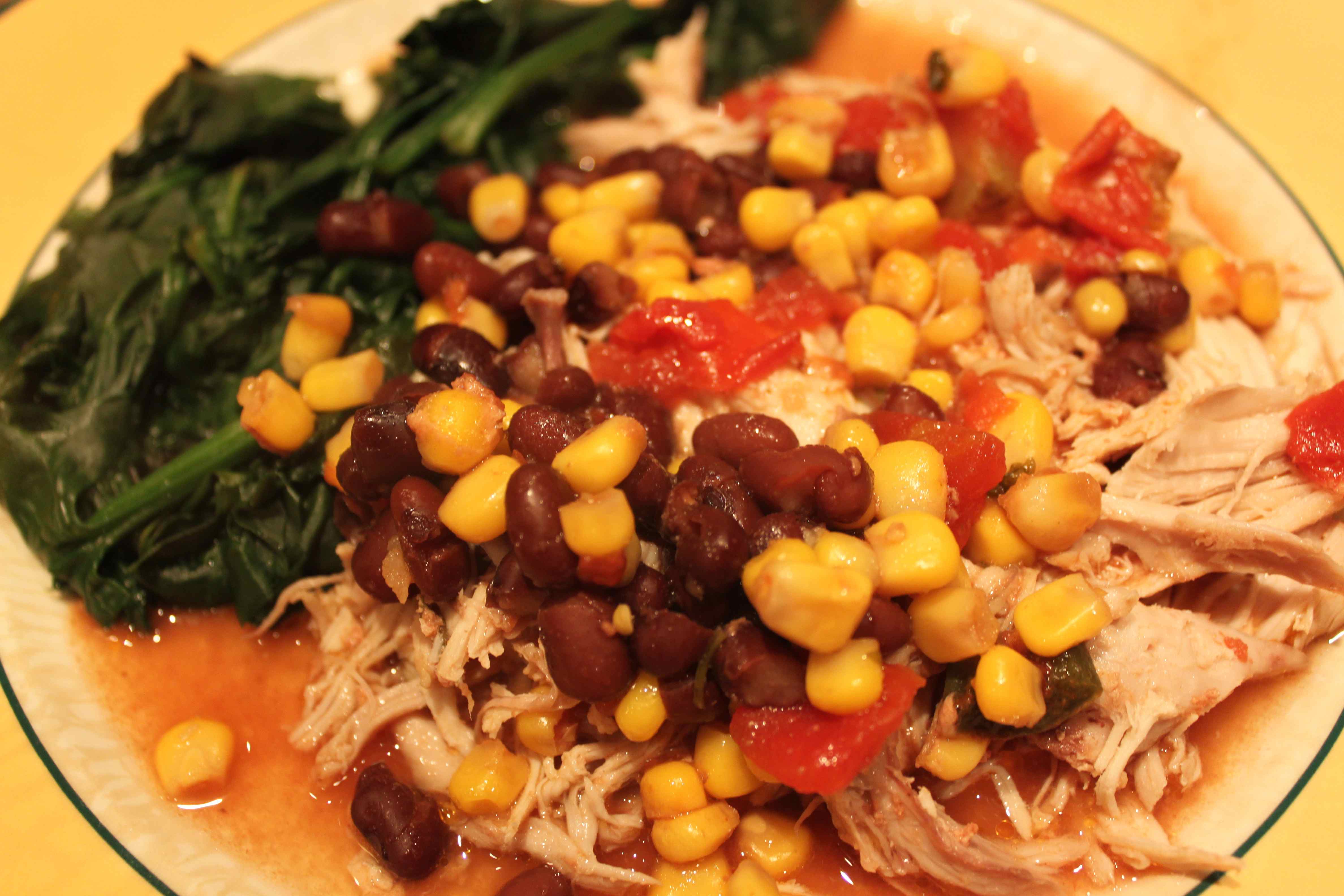 The boys went to get a curry but for the woman and child, supper was a healthier option of chicken with rice and/or vegetables. Adapted from a recipe on Skinny Taste for Crock Pot Santa Fe Chicken, I used the slow cooker and made a delicious chicken and vegetable dinner.