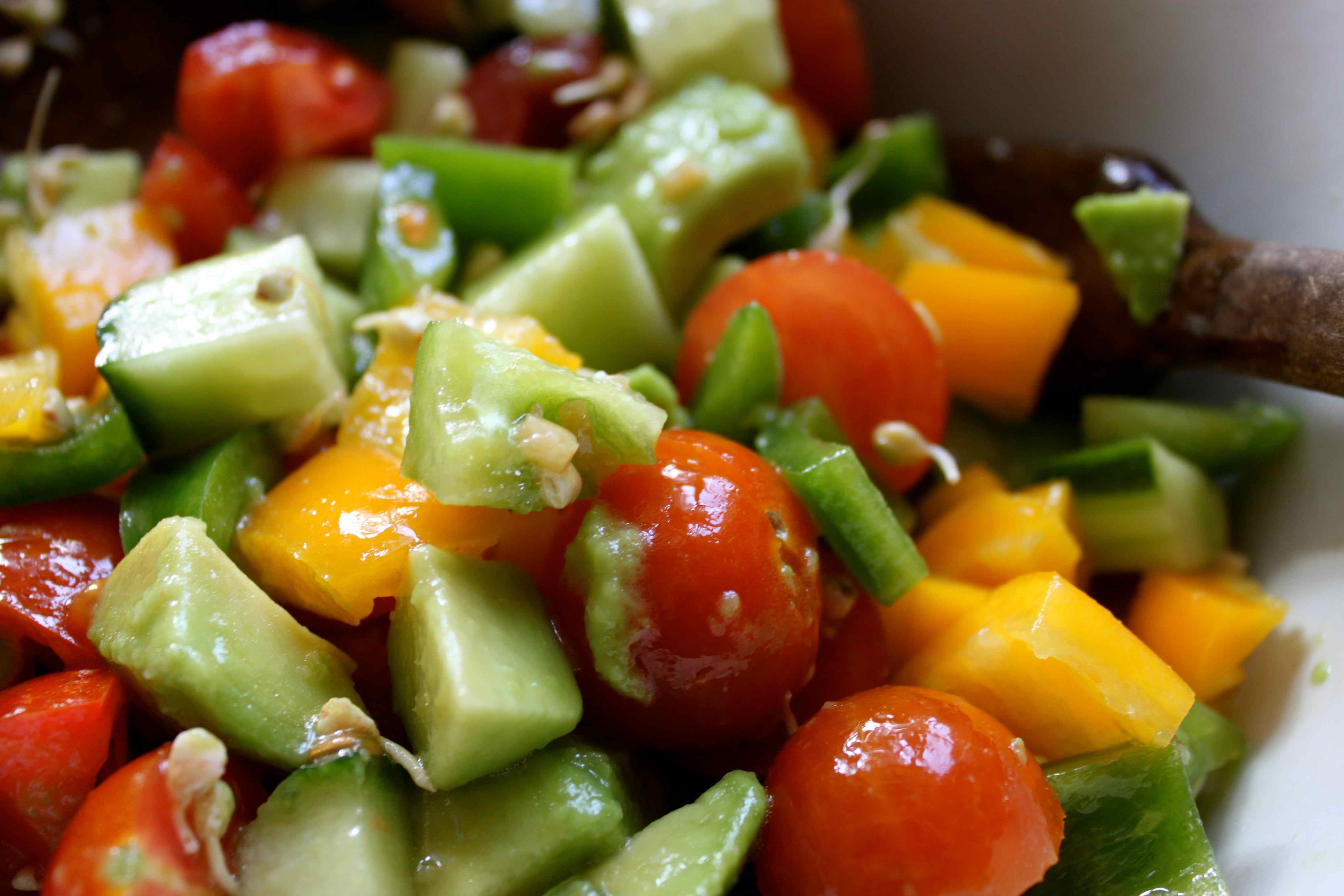 Here’s a sign of a good friend – one who sits and eats your detox lunch alongside you – thank you Sally. We made a salad from tomatoes, cucumber, green and yellow pepper, avocado and buckwheat sprouts, with an olive oil, vinegar and lime juice dressing.