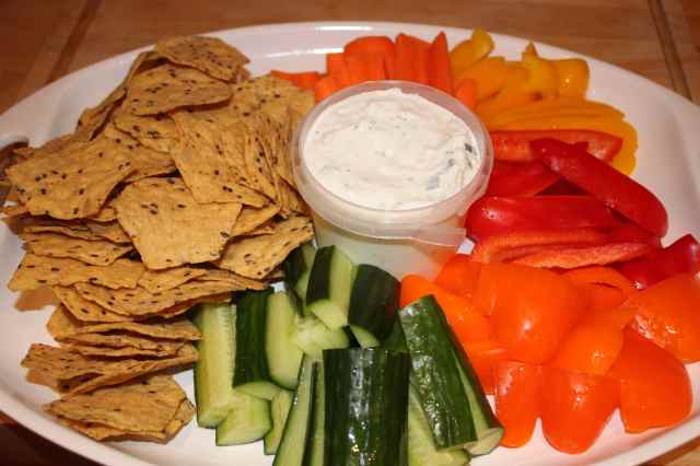 A healthy platter of raw peppers, carrots and cucumber with a dip and some delicious tortilla chips made with linseed, sunflower and sesame seeds, quinoa, soya and brown rice.  They were really good and I will buy those again.
