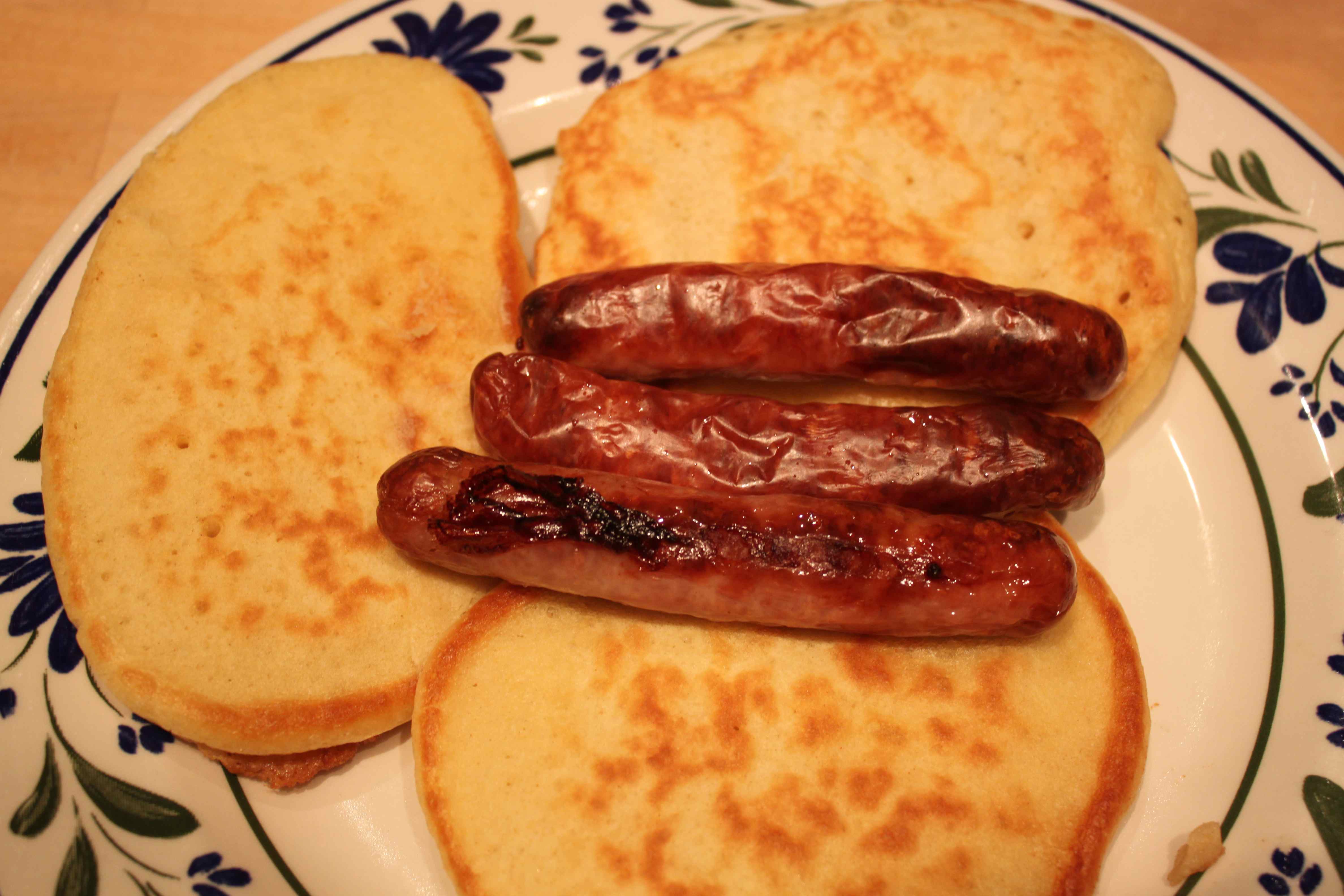 Being the amazing Mother that I am ( 🙂 ) I made my little boy pancakes, even though I did not have enough points left to have any myself. I made our family favourite American pancakes and he ate them with sausages and about a gallon of maple syrup.