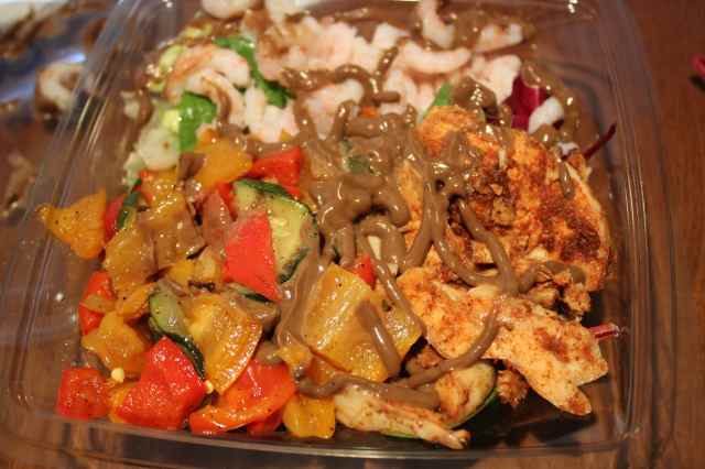 On a base of salad leaves was some spicy chicken, prawns and roasted vegetables. The brown stuff all over the top, which looks revolting,was a Balsamic dressing which actually tasted really good. The salad was good too. It all tasted fresh and I really enjoyed it.