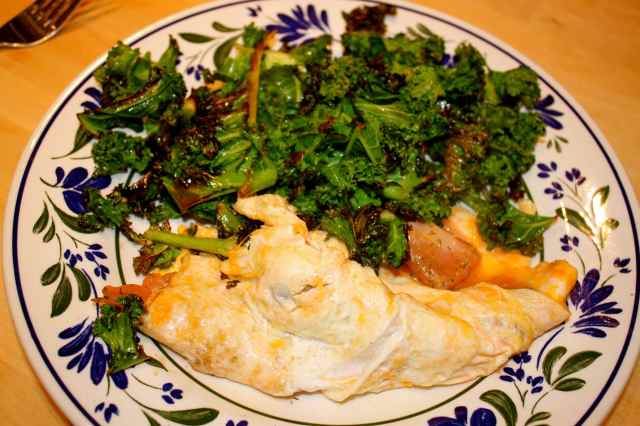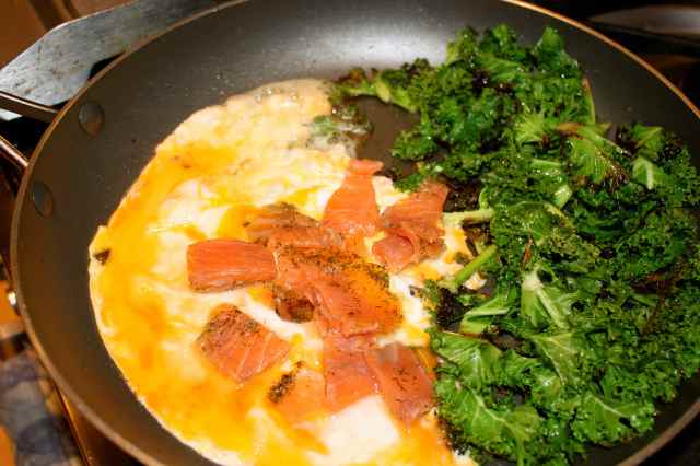 Back home I made a quick but nutritious supper of a smoked salmon omelette (85 g smoked salmon and 2 eggs) with a heap of kale. I fried it in one pan to save on washing up.