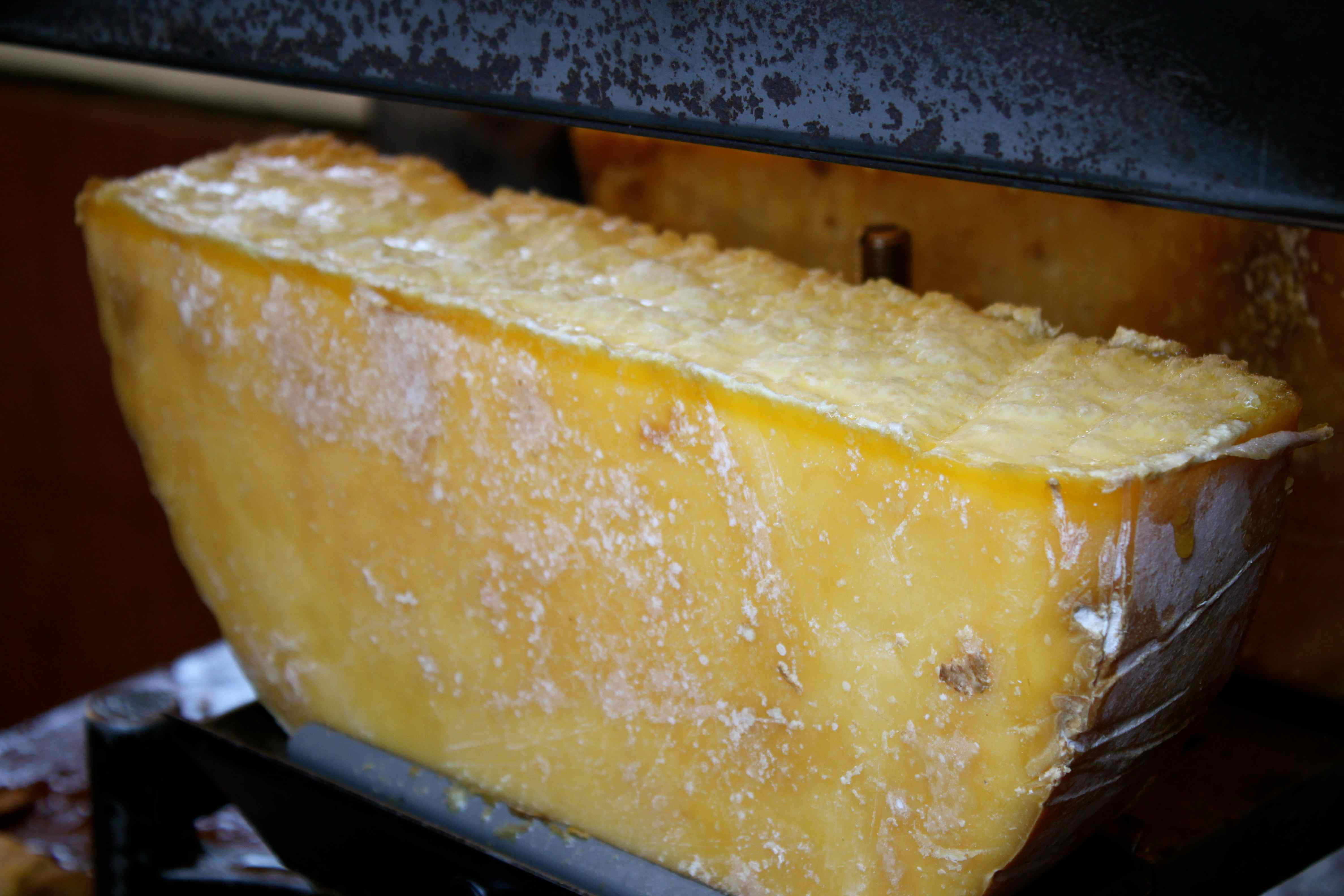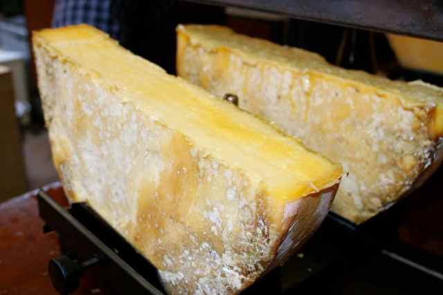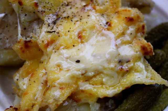 and once melted it is scraped on to potatoes and served with gherkins and small onions.