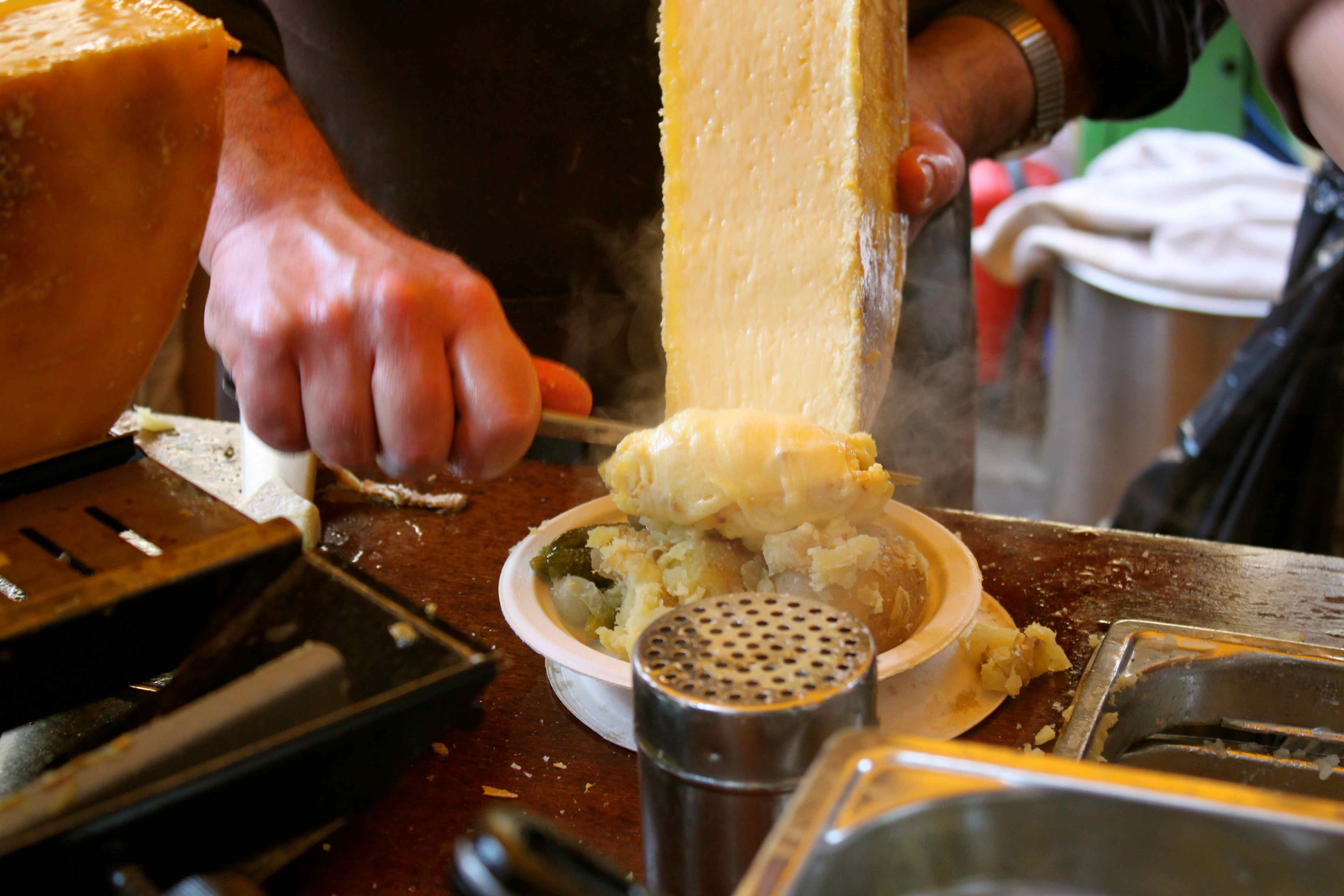 I wanted to buy it all! But for lunch I went to the Raclette stand. The last time I was in the market on a busy day I had already eaten lunch but I have wanted to try a Raclette ever since. The cheese is cut and placed in a special contraption