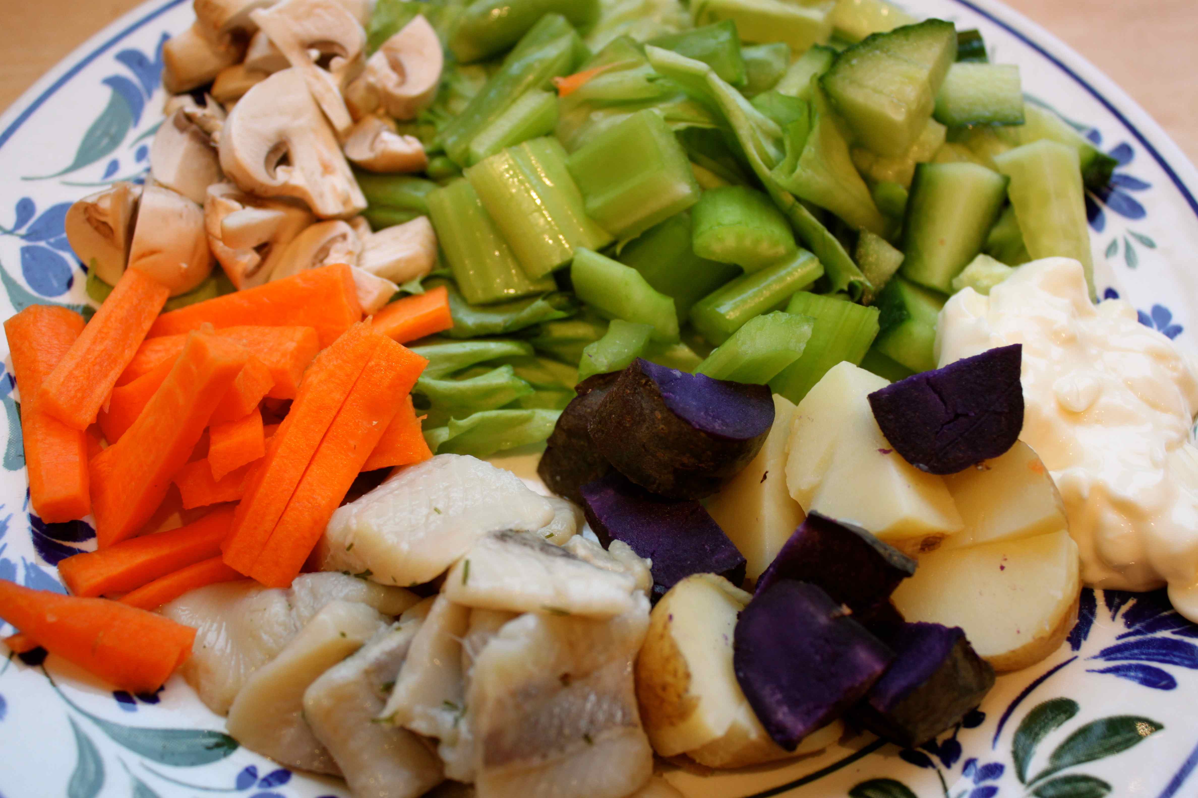 My protein came from the picked herring with dill. I love rollmops, and have not had them for ages. They go perfectly with boiled potatoes and a blob of mayonnaise. Look at the colour of this boiled potato (I made extra yesterday). I have not edited the colour at all, it really was that purple.