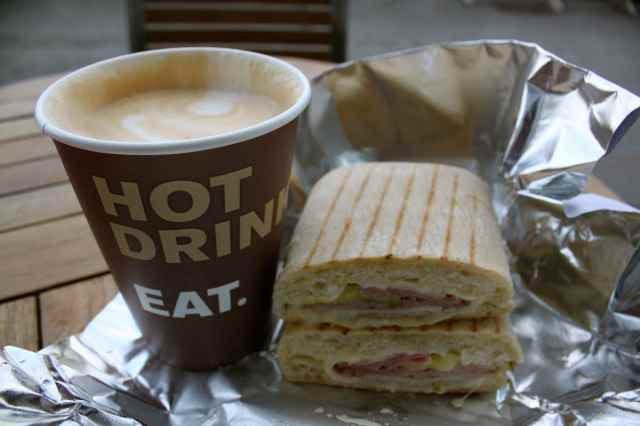 I bought a small skinny latte and a Cubanos which was a toasted cheese and ham sandwich. But it had a very harsh spicy something in it, which added no flavour but a sharp and unpleasant chilli kick. I will not be buying that again. I ate half outside and had the rest at my desk.
