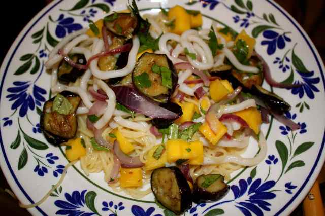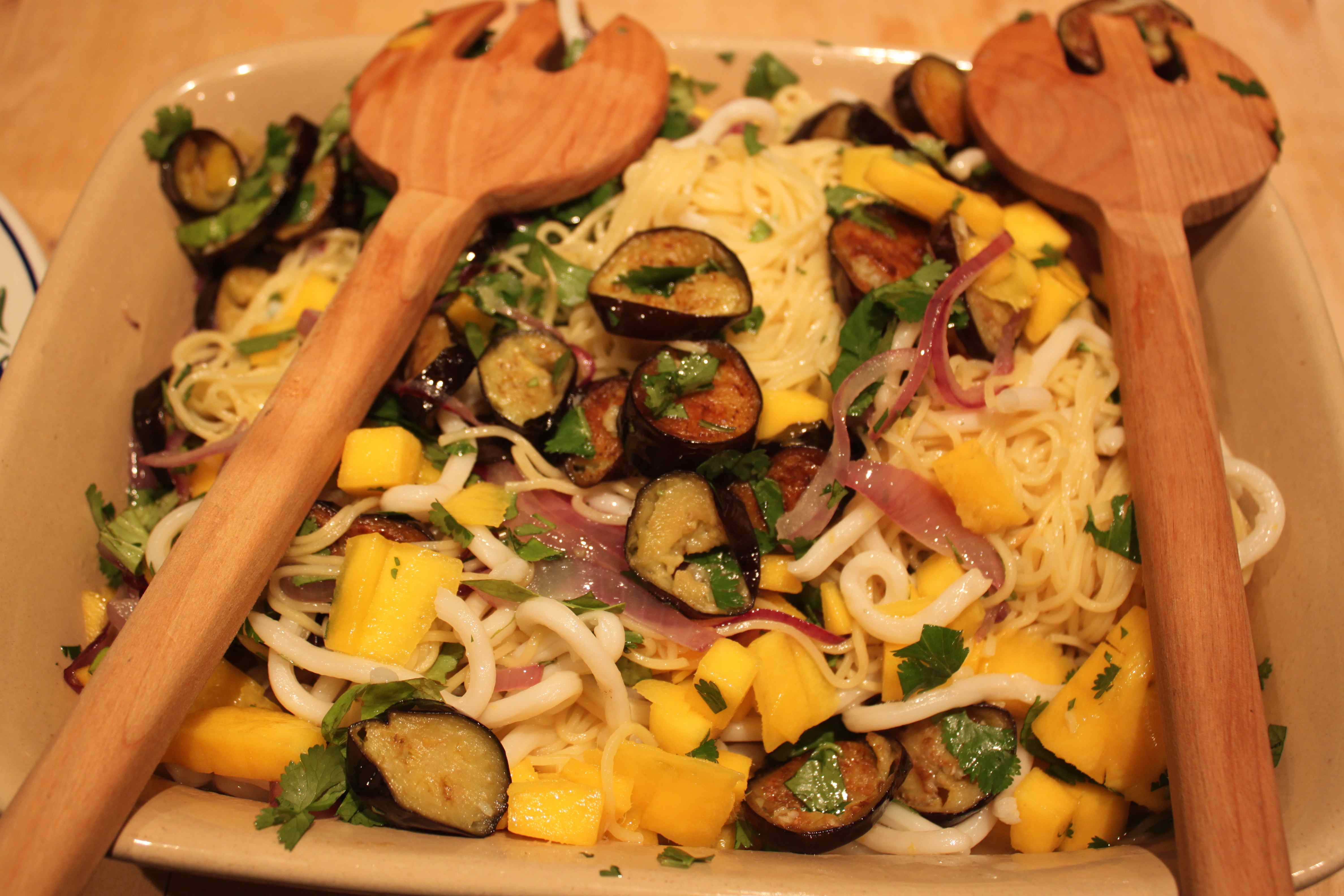 - In a mixing bowl, toss the noodles with the dressing, aubergine, onion, mango and half the herbs.