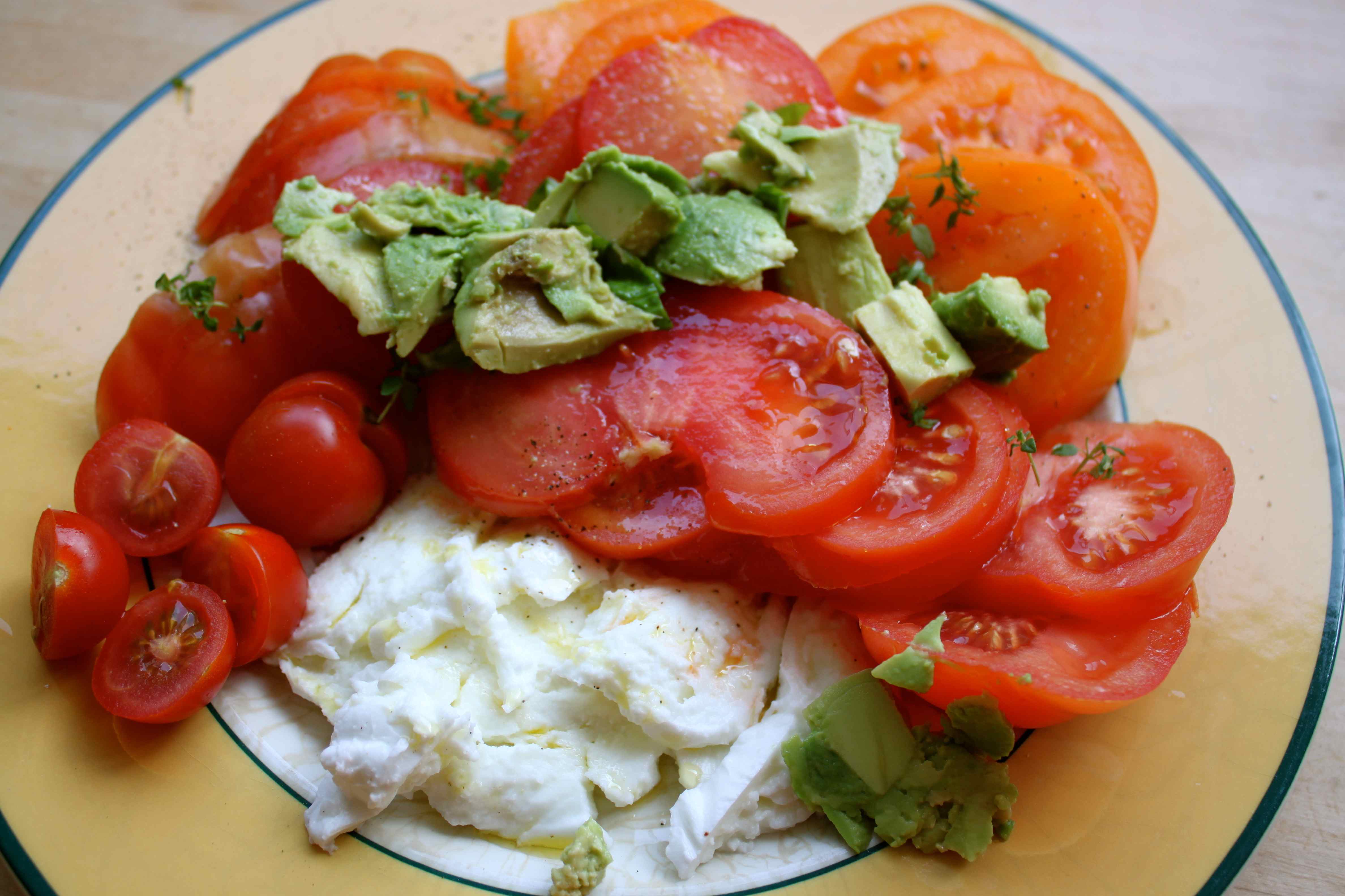 Chopped up with Mozarella and an avocado, drizzled with olive oil, sprinkled with fresh basil, oregano and salt and pepper.