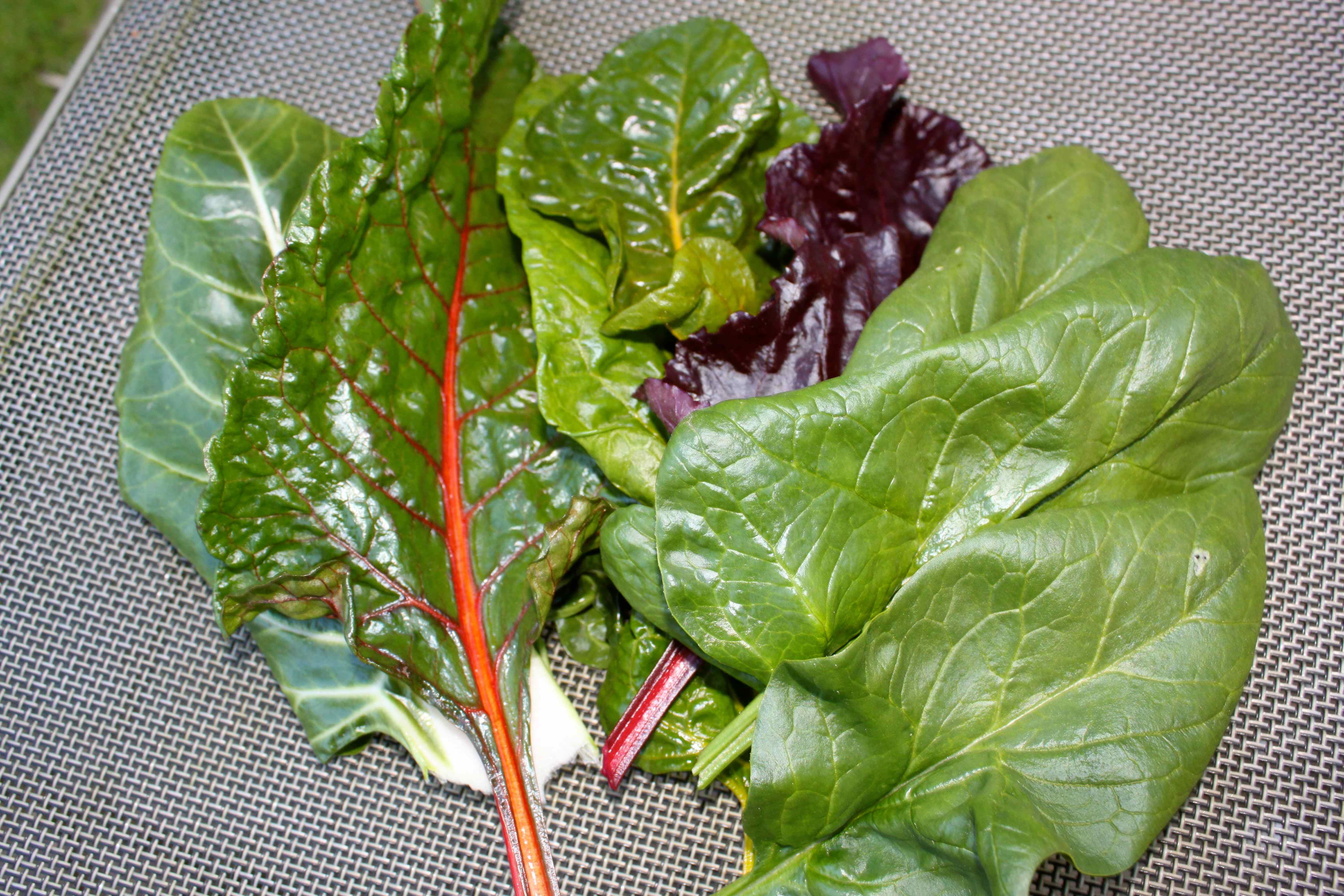 I picked red, yellow and white stemmed Swiss chard, spinach (large leaved variety called New Zealand spinach) and Bulls Blood beetroot leaves.