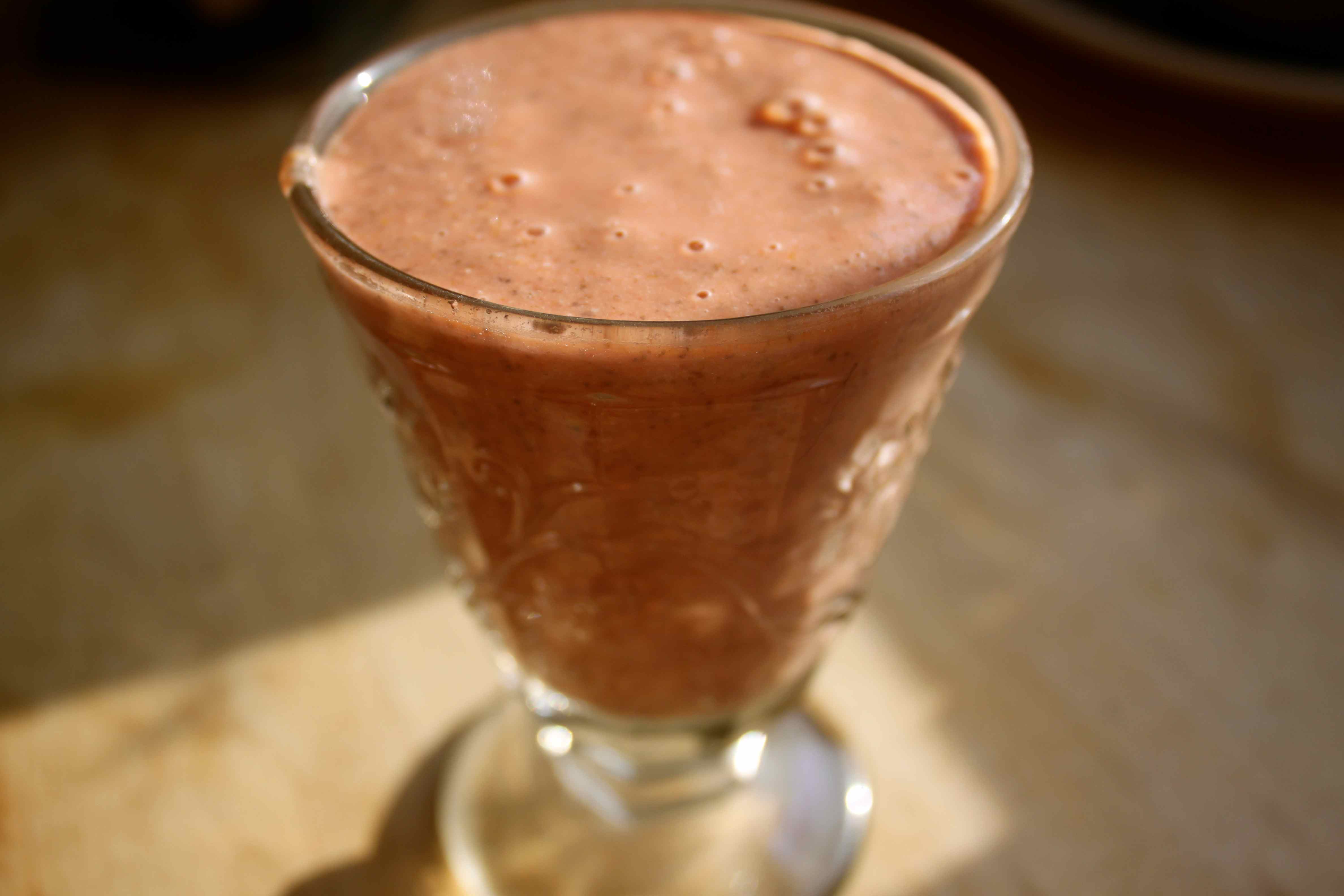 I put them in the blender with almond milk, 1 tbsp chia seeds and 2 tbsp oats. Interesting colour and it tasted very pleasant.