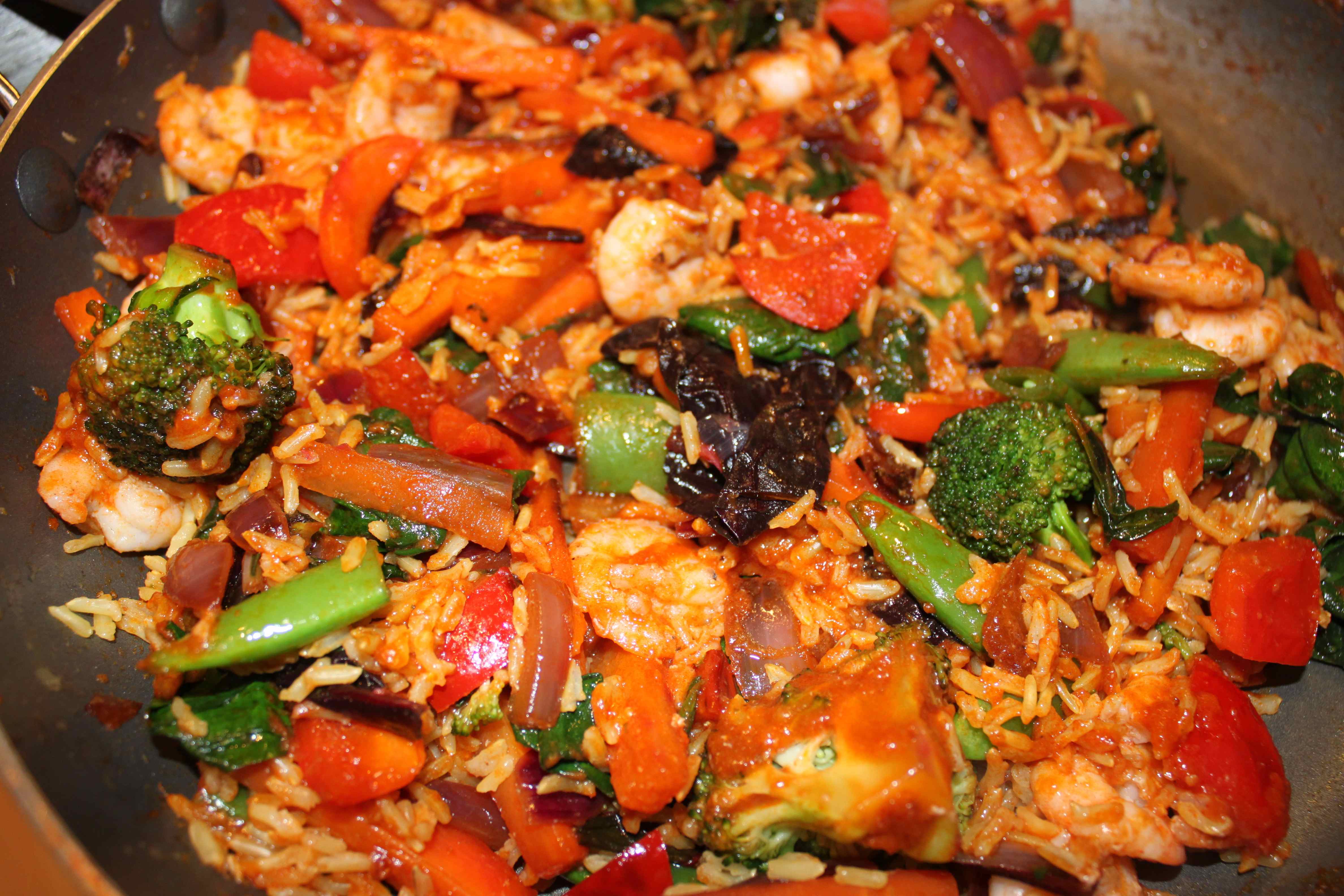 I put all the vegetables in to a bowl, fried the prawns, which I had bought raw, and then added the cooked prawns to the vegetables. I had a jar of Nasi Goreng sauce so I added that to the wok, fried it for a minute or so and then added the vegetables, rice and prawns.