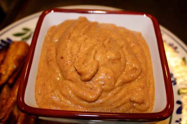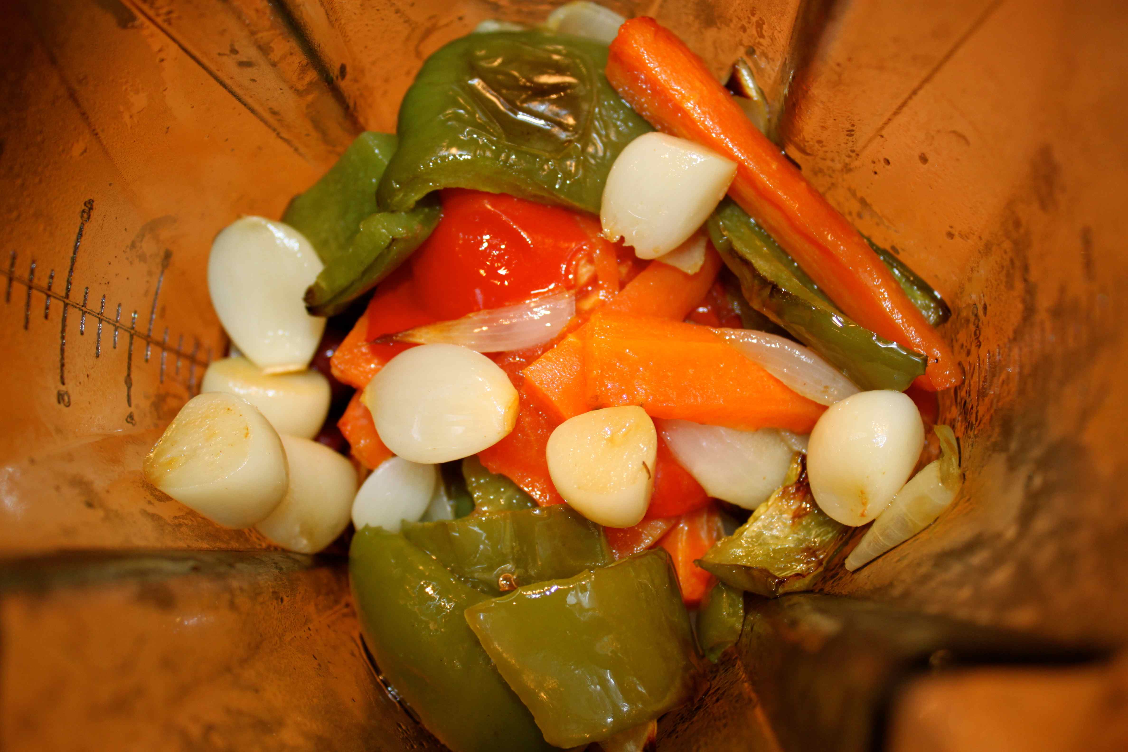 I was stressed out when I came home so I decided to cook something. A friend of mine, Maria, had asked me if I had any good dip recipes and I have been intending to make one up for a while. Tonight was the night. I put a can of red kidney beans in the blender with 1/4 of a fresh pineapple. In the oven, I roasted a carrot, green pepper, onion, large plum tomato and half a head of garlic. When they were cooked, I blitzed it to a smooth puree.