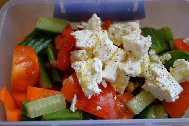 cucumber and Feta and also added some sugar snaps and carrots. A grind of pepper and 1 tbsp olive oil and I was sorted.