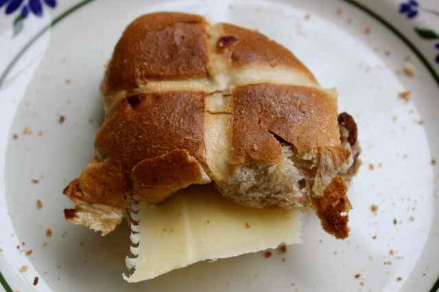 8 years ago we were in Holland for Easter and were served a toasted fruited bun with cheese in it which I loved.  I enjoyed my breakfast hot cross bun so much I had another one with cheese in it – a slice of Comte.  Absolutely delicious – you should try it sometime.  Cheese and hot cross buns are yummy.