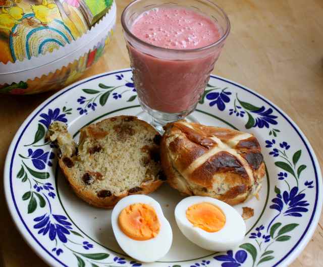 Breakfast was Eastery – a hot cross bun, boiled egg and a strawberry and banana smoothie.