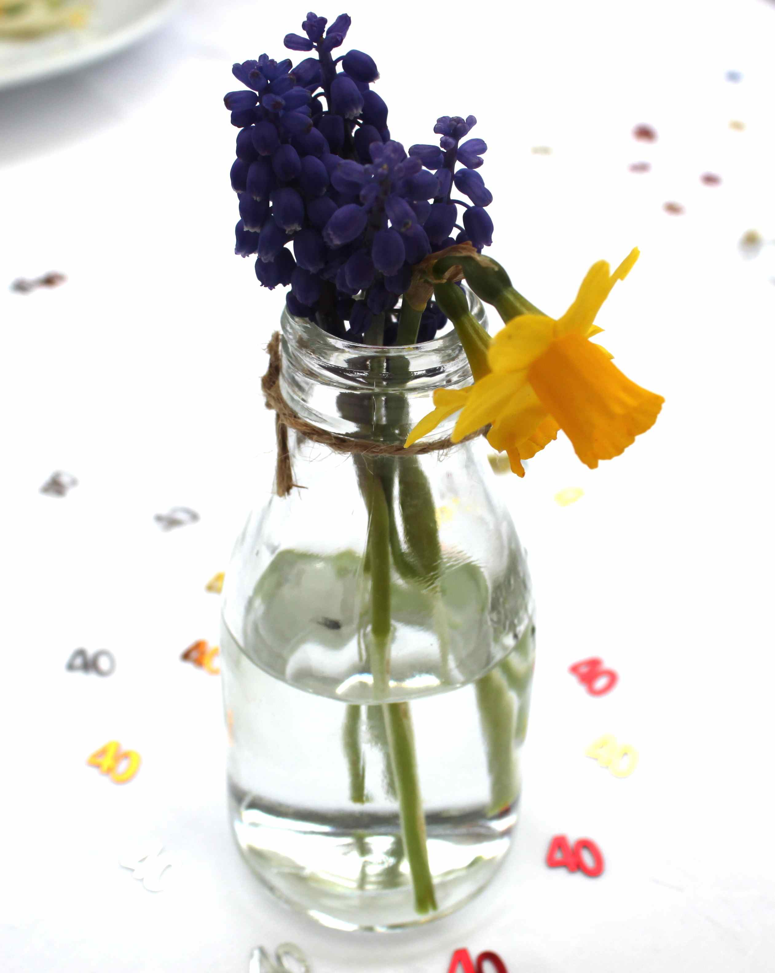 I really enjoyed every mouthful.  The pork was tip top and so was the potato and stuffing. It was one of those meals I could have eaten again but I saved room for dessert instead.  On the tables were these pretty baby bottles of grape hyacinth and daffodils – aren’t they cute?