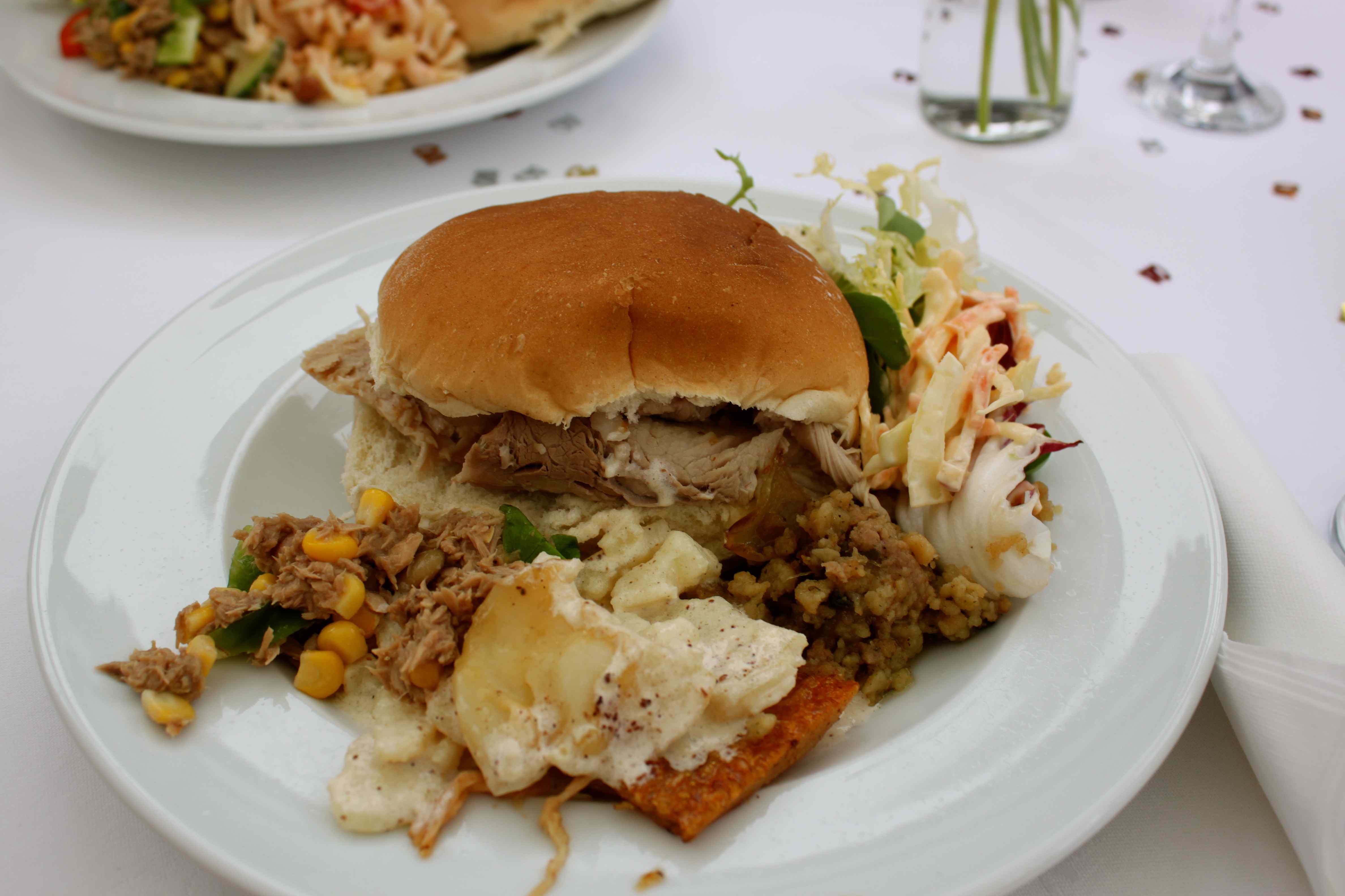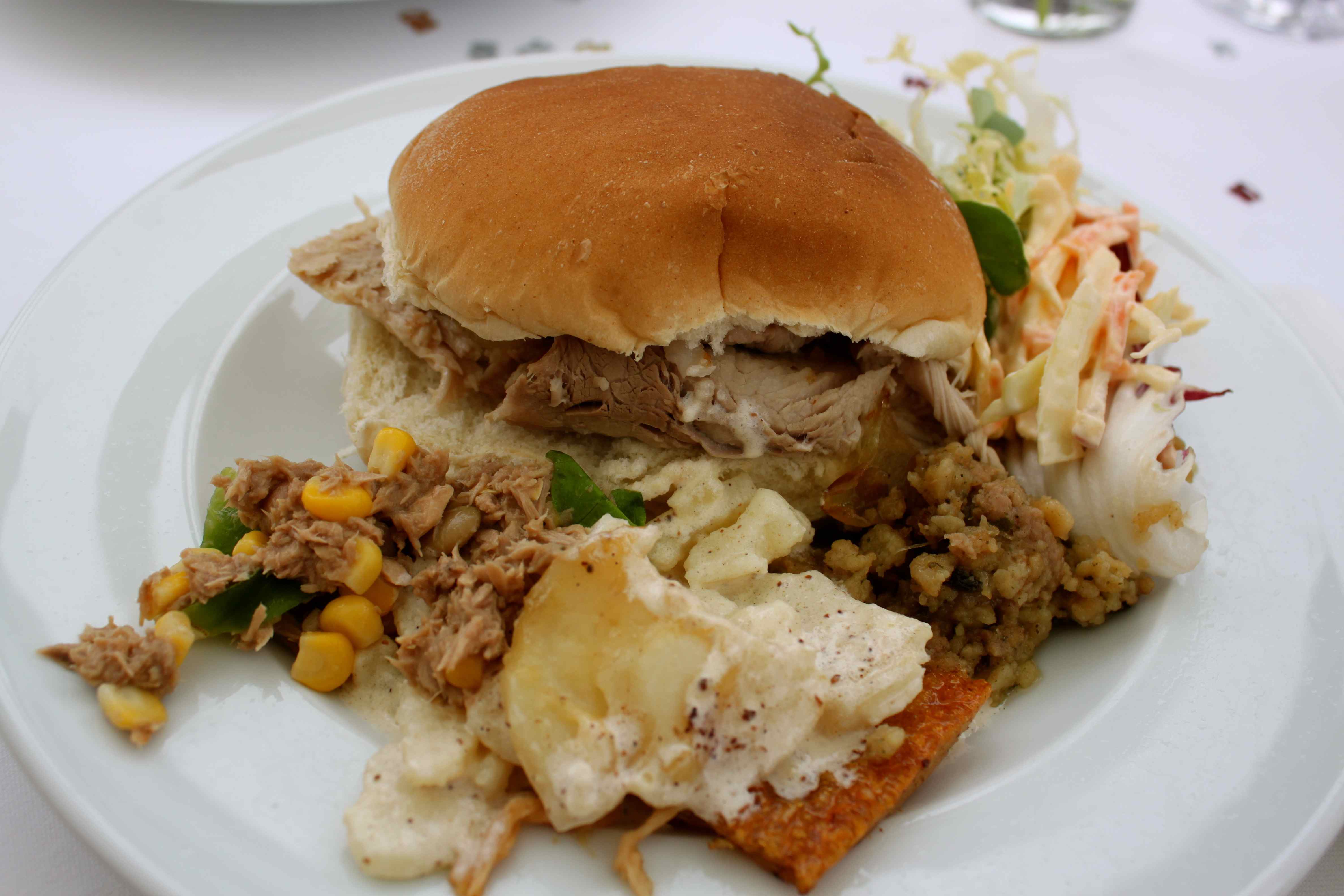 It was fantastic.  I like hog roasts anyway and this one was particularly good.  The meat was tender and succulent and the crackling was super crispy.  There was home made apple sauce, a delicious stuffing, Dauphinoise Potatoes, green salad and coleslaw.  There was more too, including a whole salmon but my plate was full!