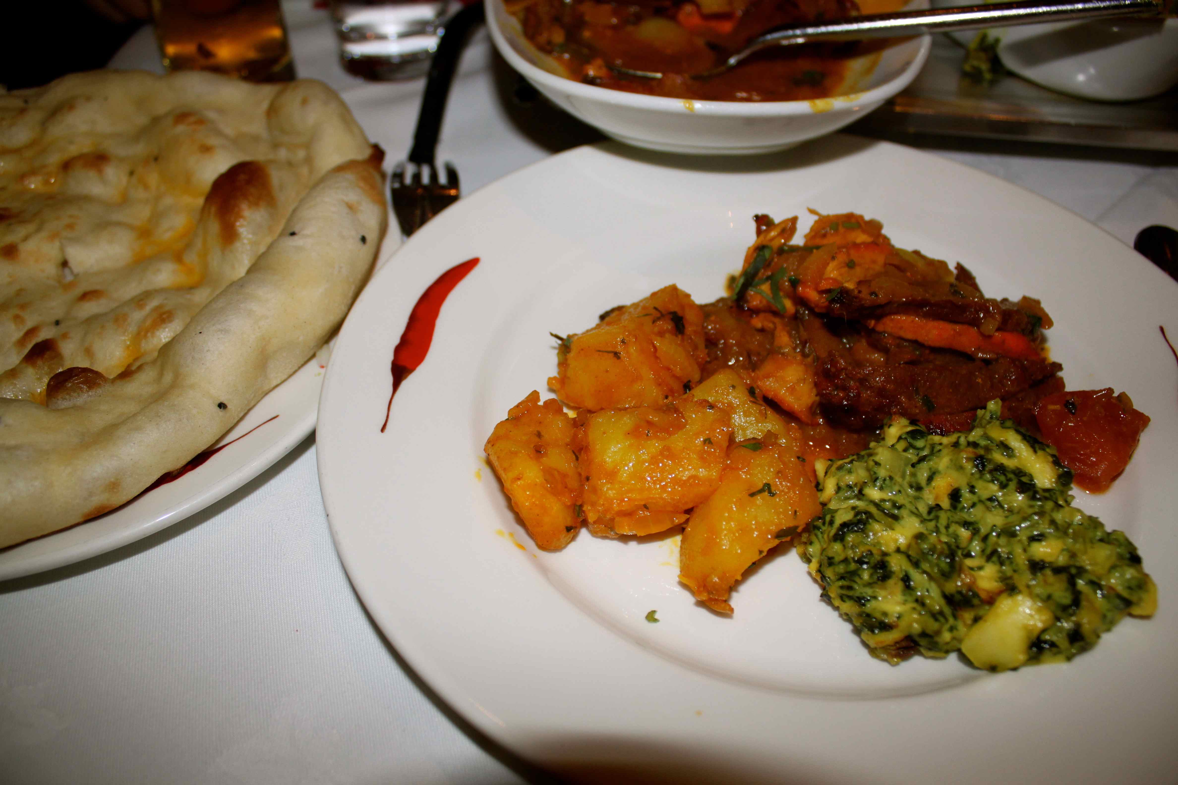 Then a plate of mixed tandoori lamb and chicken, sag paneer (spinach with cheese) and Bombay potatoes with some naan bread.