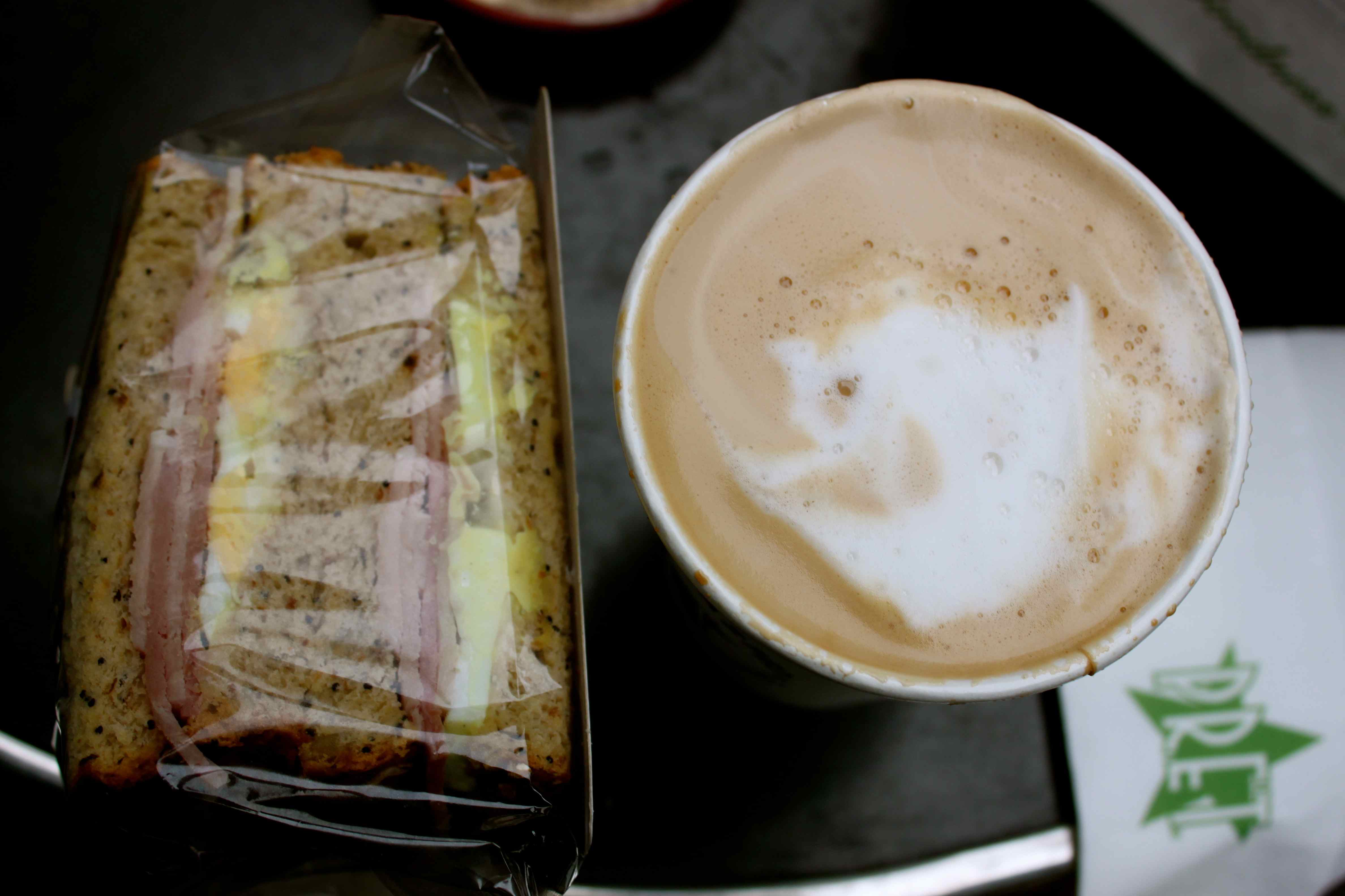 I had to go in early again today and did not manage to make breakfast at home so I ducked in to Pret by the office and bought a latte with a ham and egg sandwich.