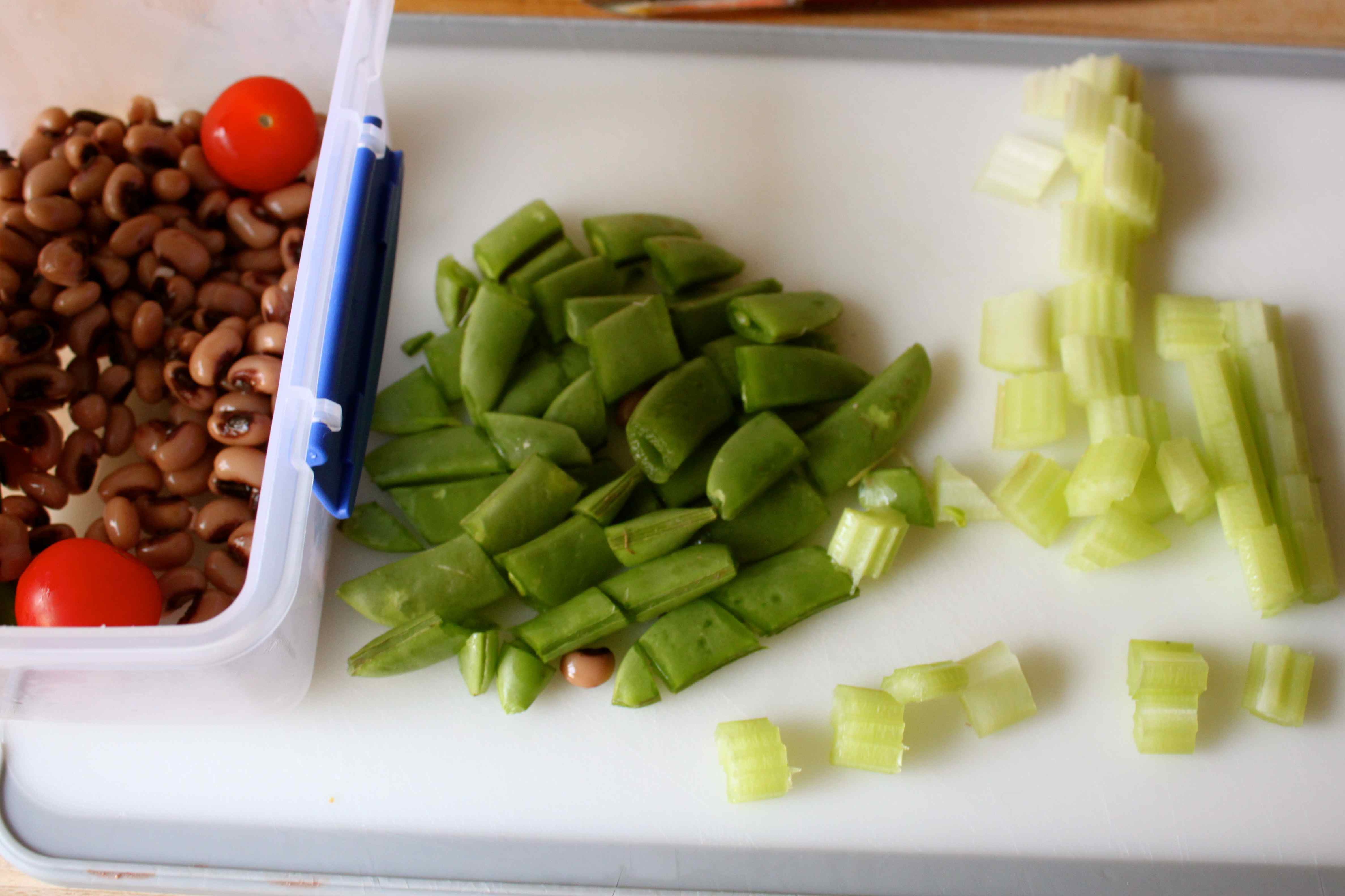 In the fridge was the 1/2 can of rinsed black eye beans in a lunch box with some cherry tomatoes. To which I added sugar snap peas and celery.