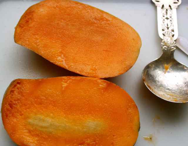 These little Alphonso mangoes are intensely flavoured and a lovely deep orange colour. They are also softer then the usual mangoes you can buy and easy to scrape out of the skin with a sturdy spoon.