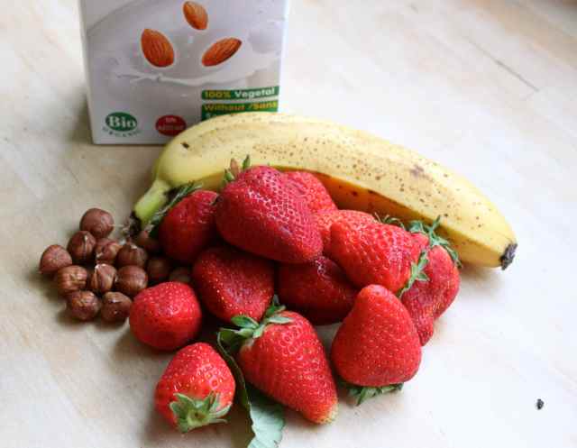 I felt really tired when I woke up – I am too old to go to bed at 2 am and then feel human the next day! I wanted a green smoothie for breakfast to help revive me but it was raining too hard so I ate what was in the fridge instead: strawberries, banana, hazelnuts and almond milk.