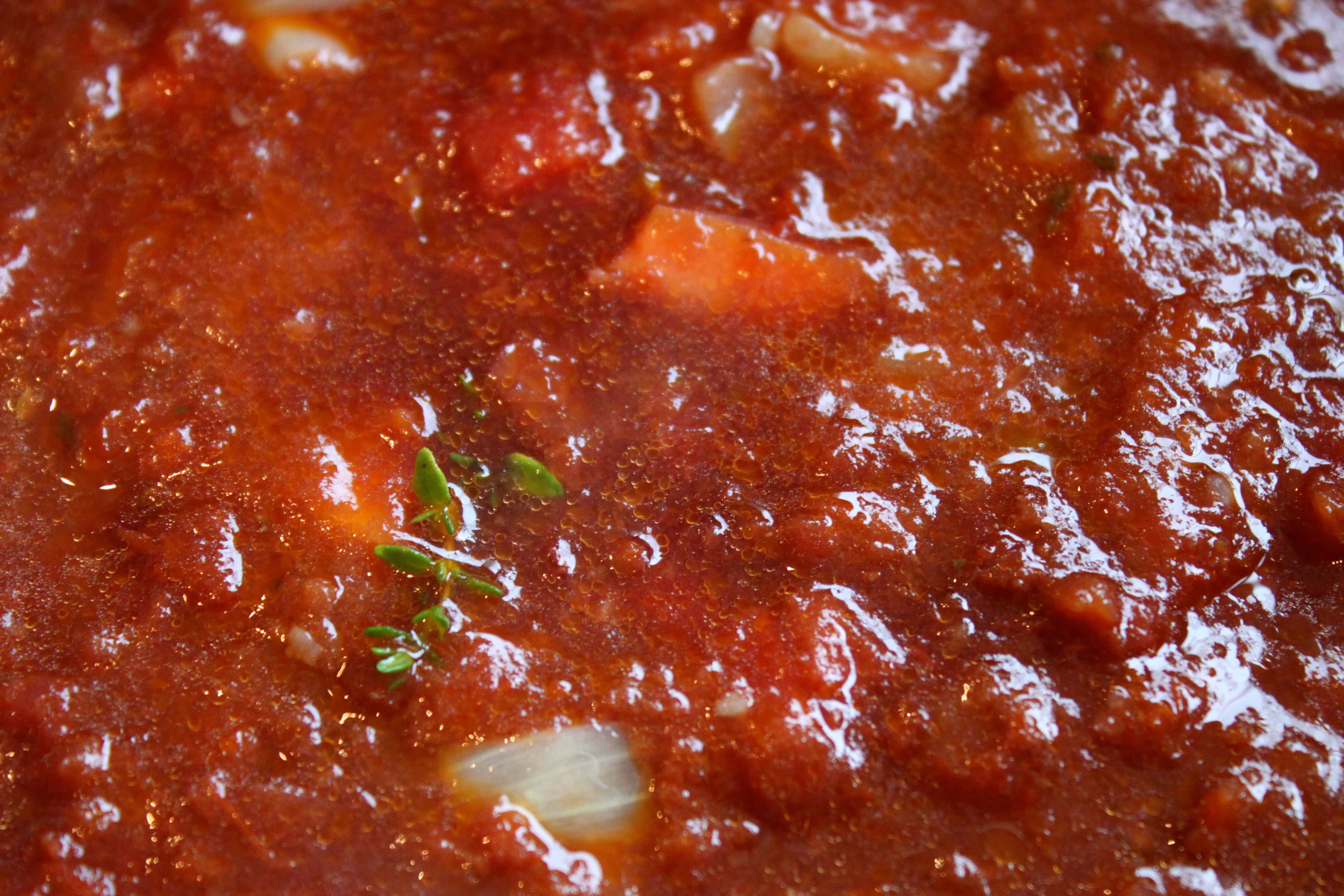 - Add the tomatoes, wine, tomato puree, thyme and salt and pepper and bring to simmering point