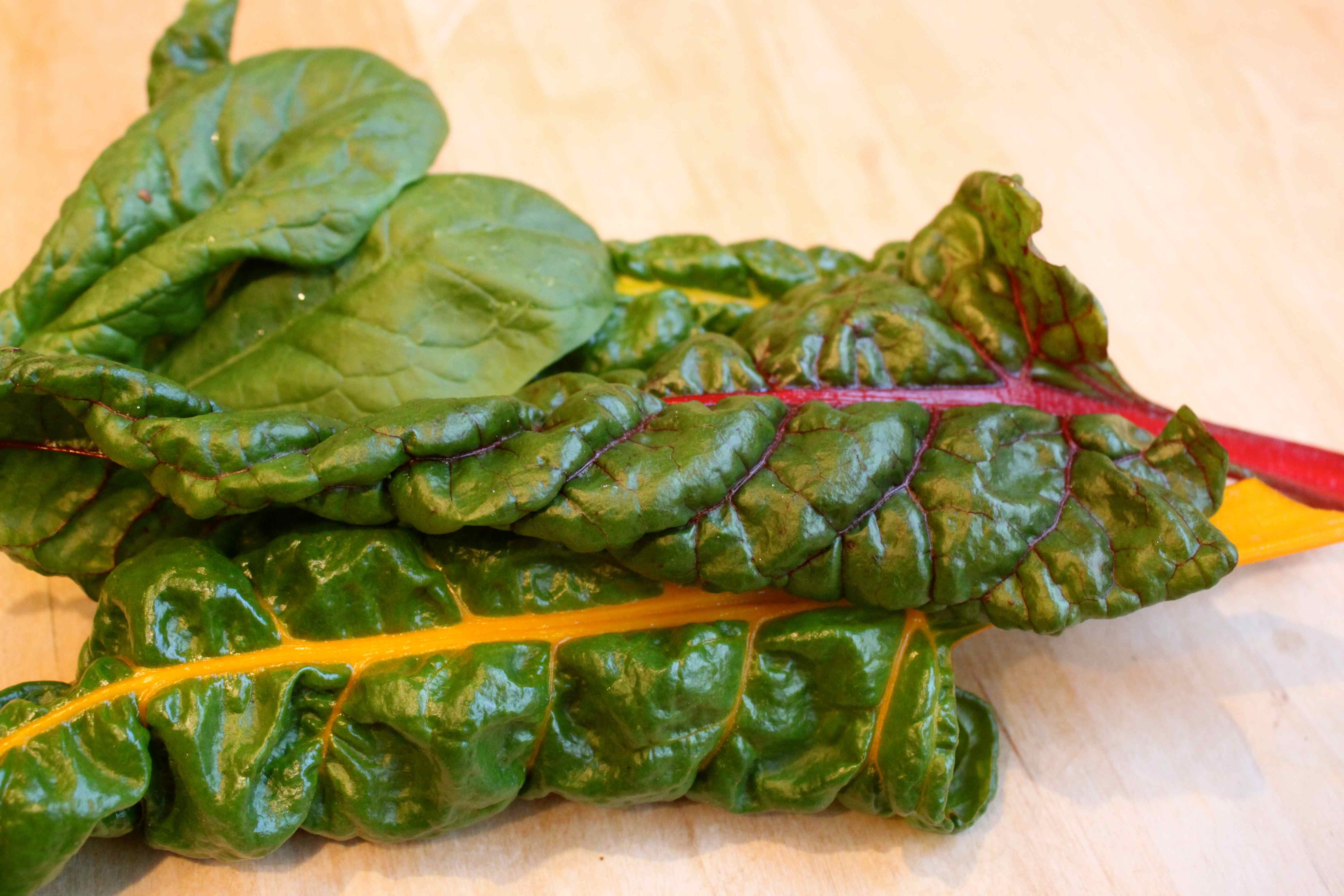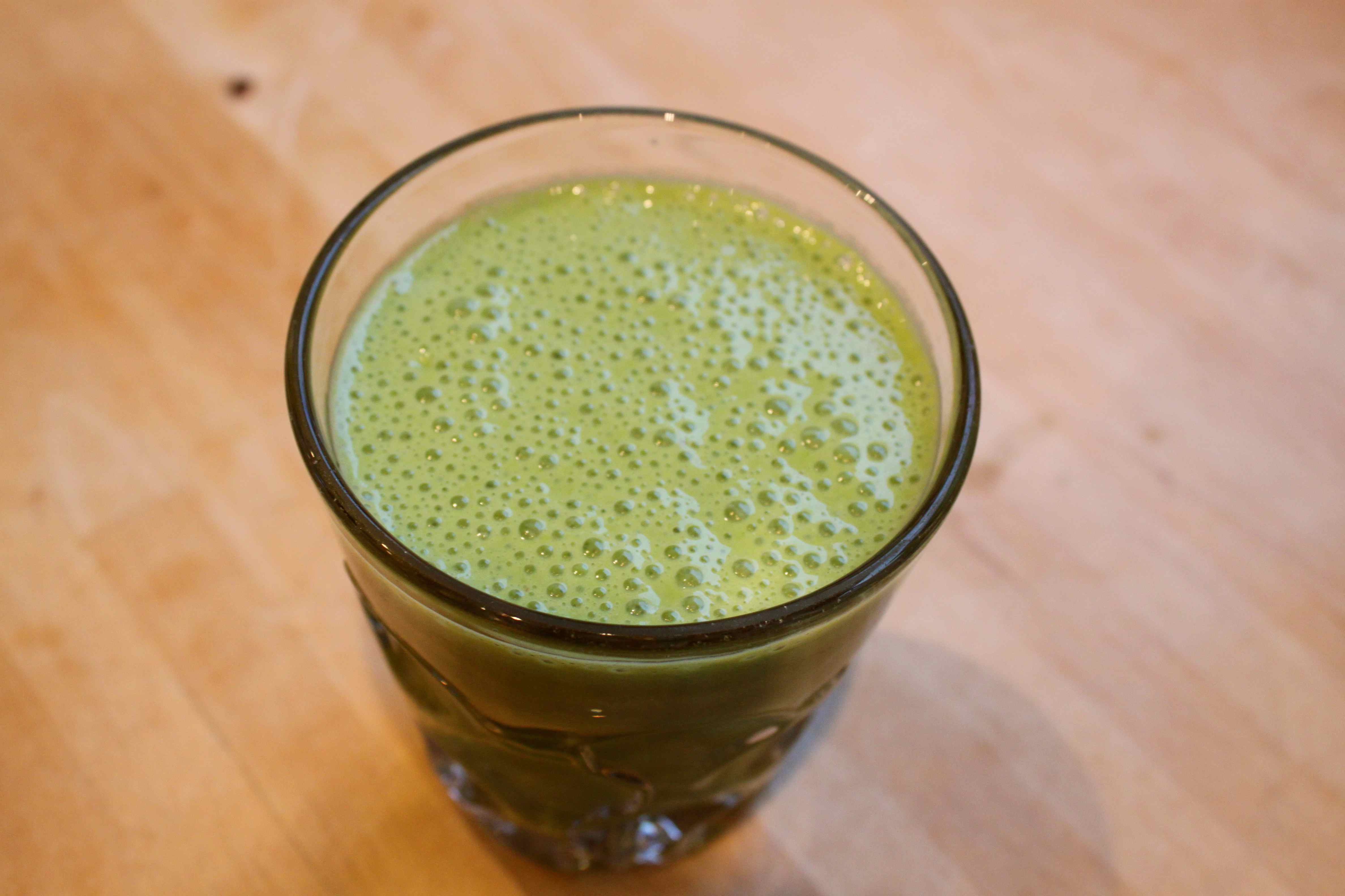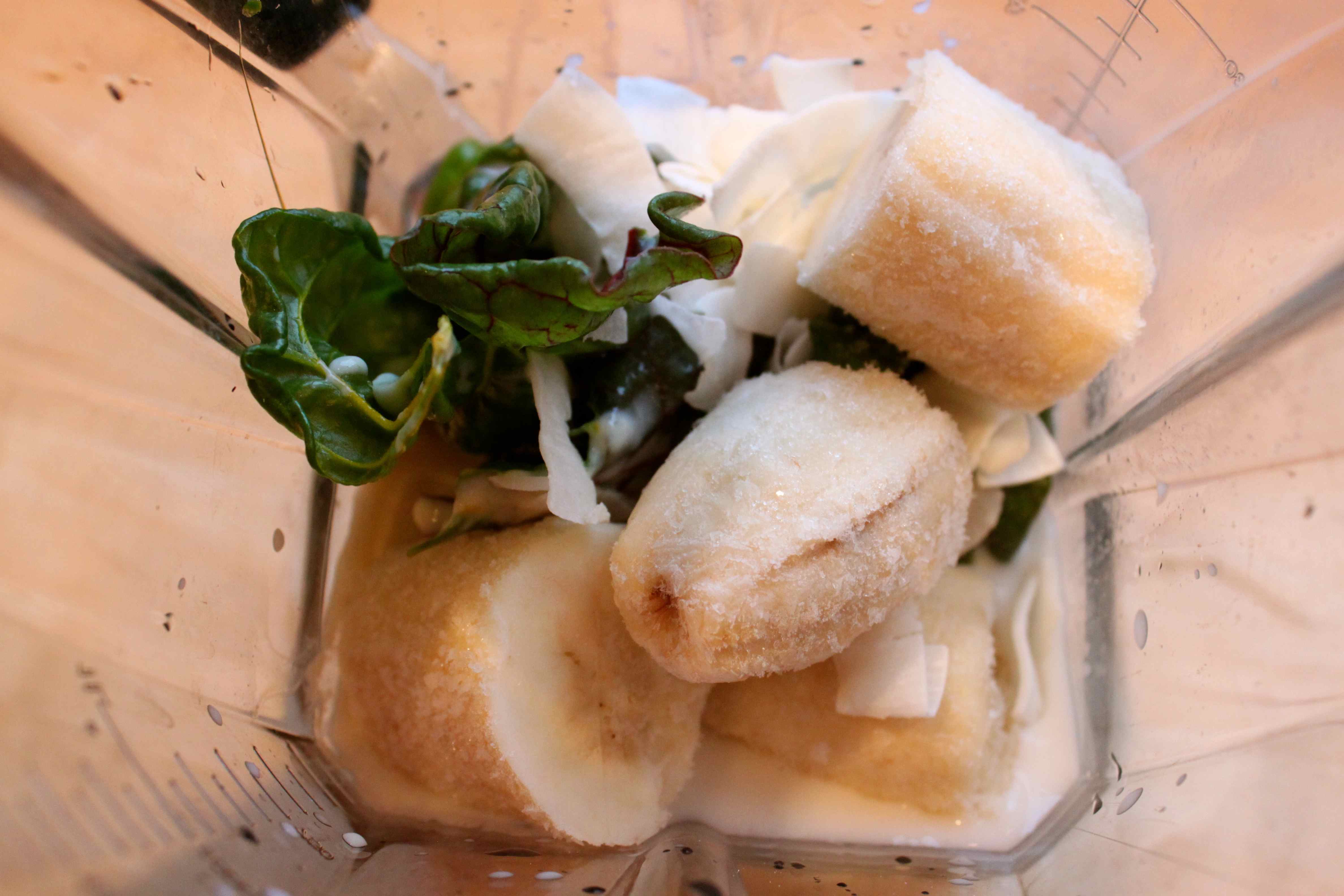 Green smoothie made of rainbow chard, spinach, coconut, frozen banana, almond milk and yogurt.