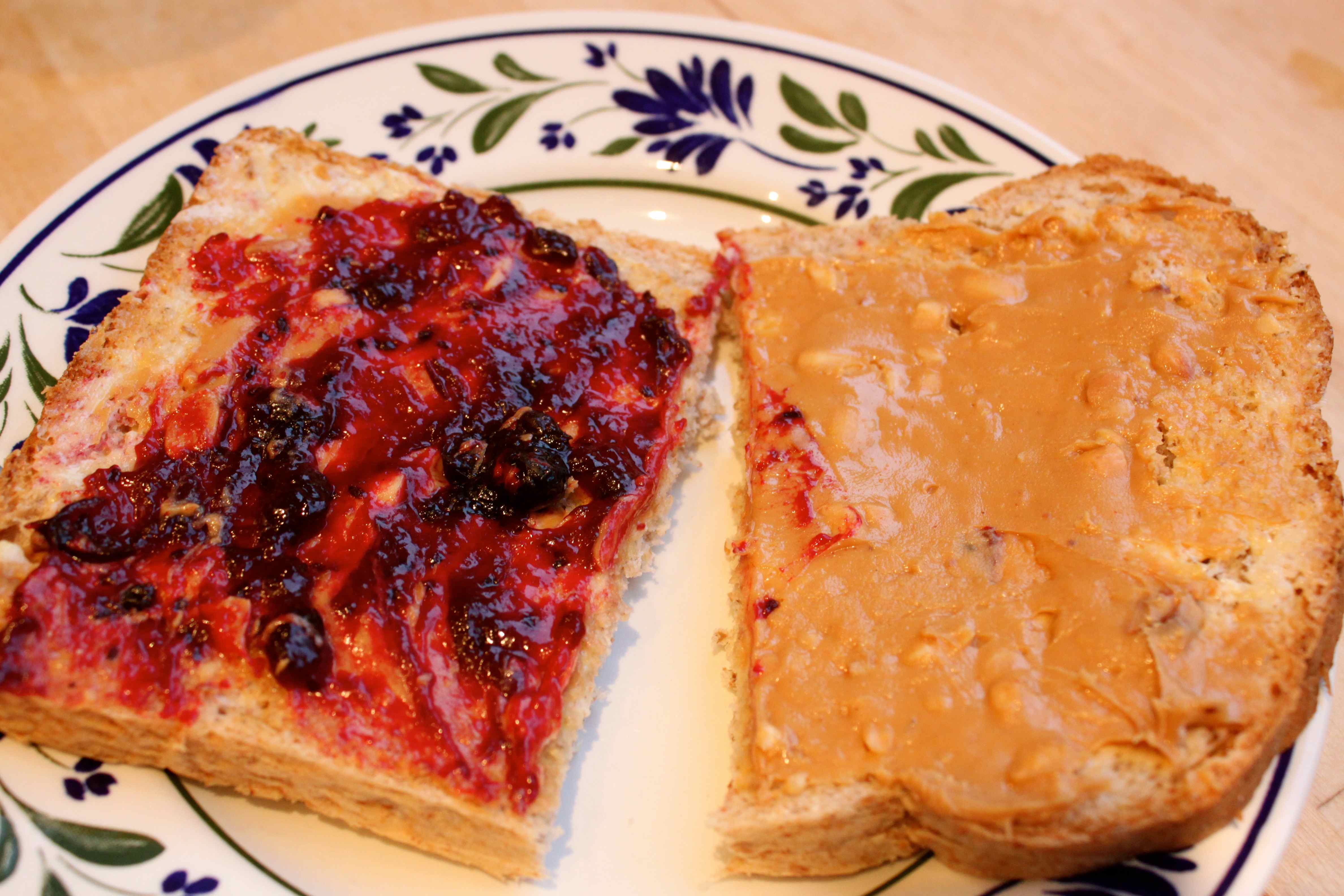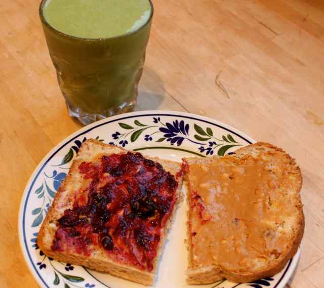 Followed by a slice of wholemeal bread with peanut butter. One half had blackcurrant jam on it too.