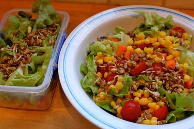I served these with mayonnaise and a mixed salad; lettuce, carrot, cherry tomatoes, sweetcorn and sunflower sprouts. I made another one to take for work tomorrow and boiled an egg to take with it for extra protein.
