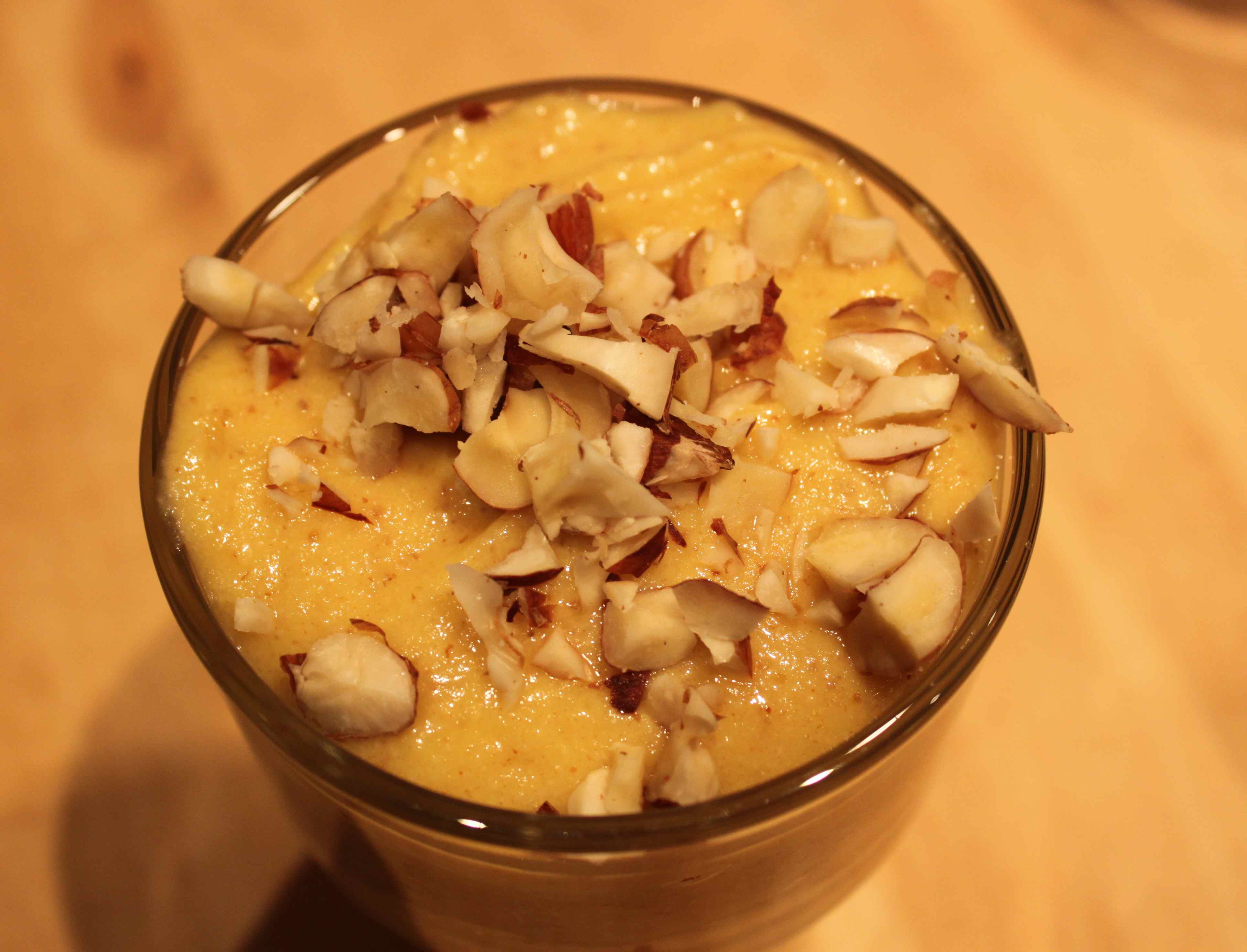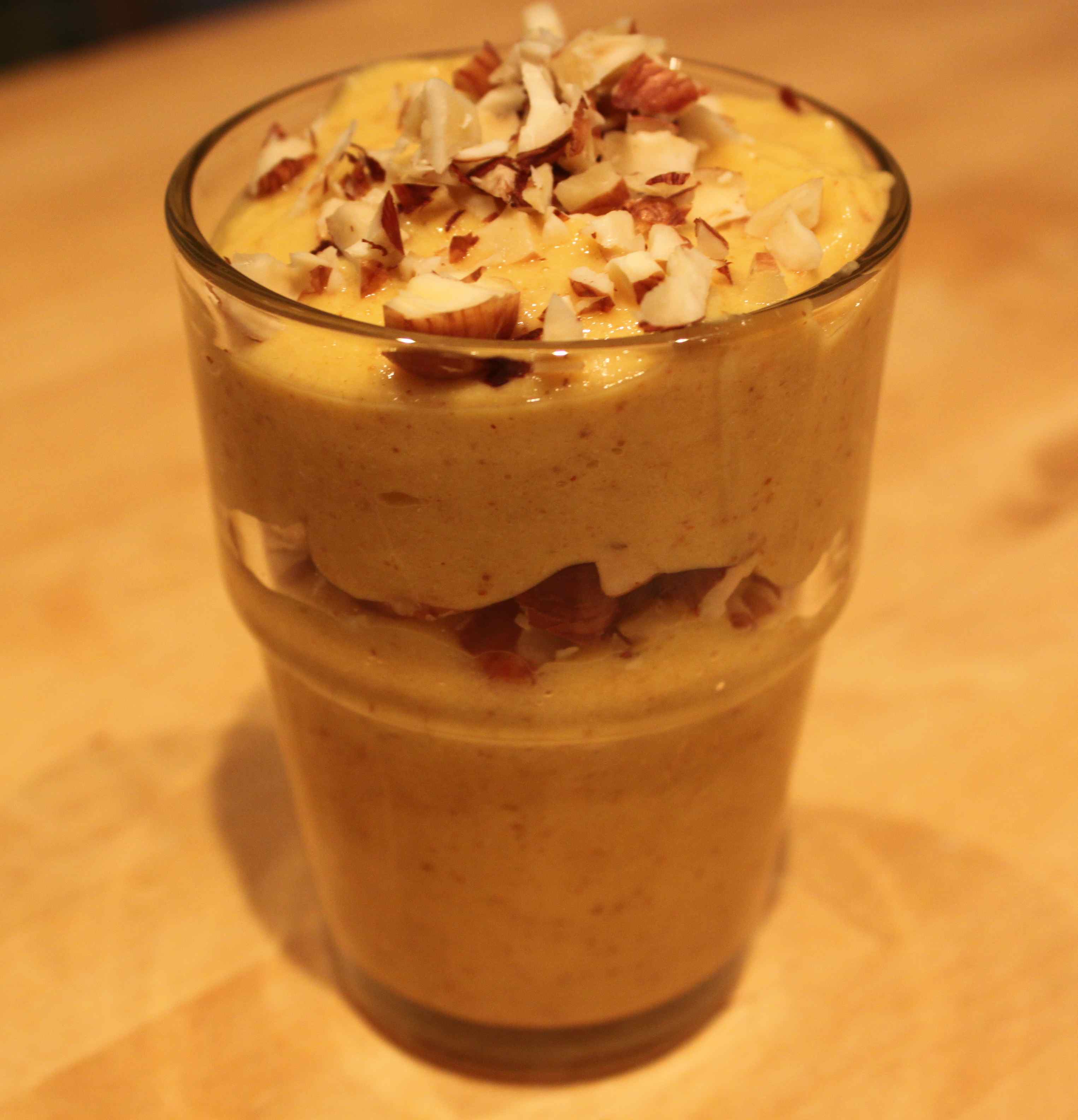This was delicious. Quite sweet but it is all natural and healthy ingredients so nothing to feel guilty about. Soaking the nuts makes them softer but they are still crunchy. And soaking the dates makes them much easier to blend. This would make a tasty breakfast too. Harvey loved it and declared it to be one of his favourite puddings ever 🙂