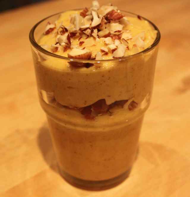 - Serve in a small glass with a layer of chopped nuts in the middle and the rest sprinkled on top.