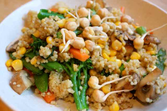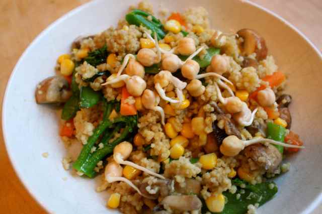 So there we have my first macrobiotic meal; millet with vegetables and sprouted chick peas. I liked it and am feeling excited about eating more grains and vegetables tomorrow.