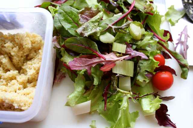 Lunch consisted of more millet, leftover salad and leftover Mozarella. Cheese is not macrobiotic either but I have to finish up what is in the fridge. Plus I am not going to be obsessive about it.