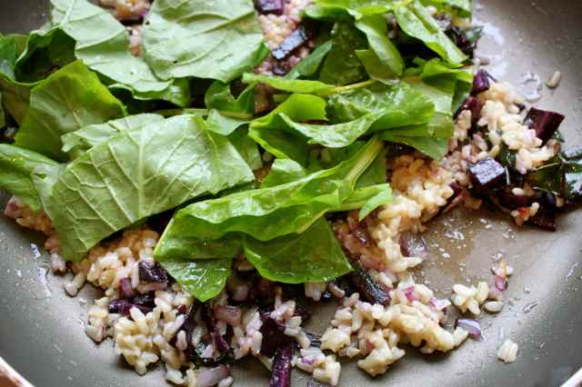 added rice leftover from the Thai green curry Lara made the other night and wilted the leaves on top,