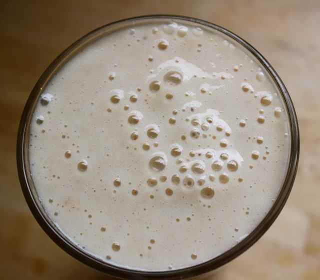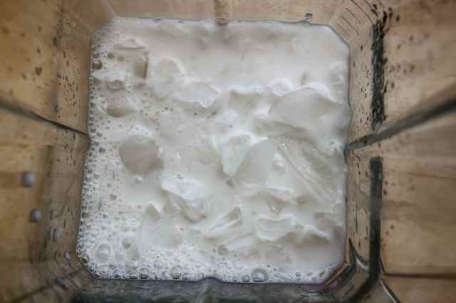 Whizzed up with lots of almond milk and ice.