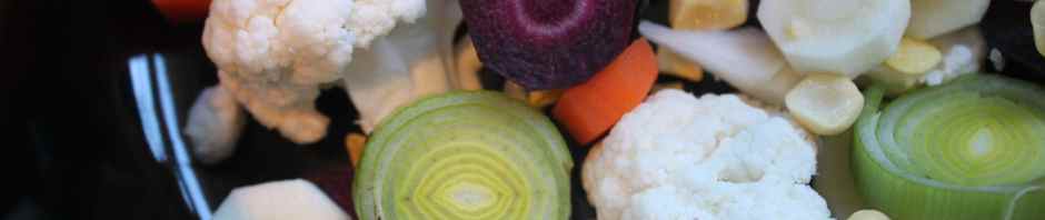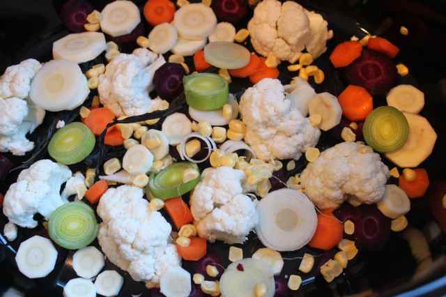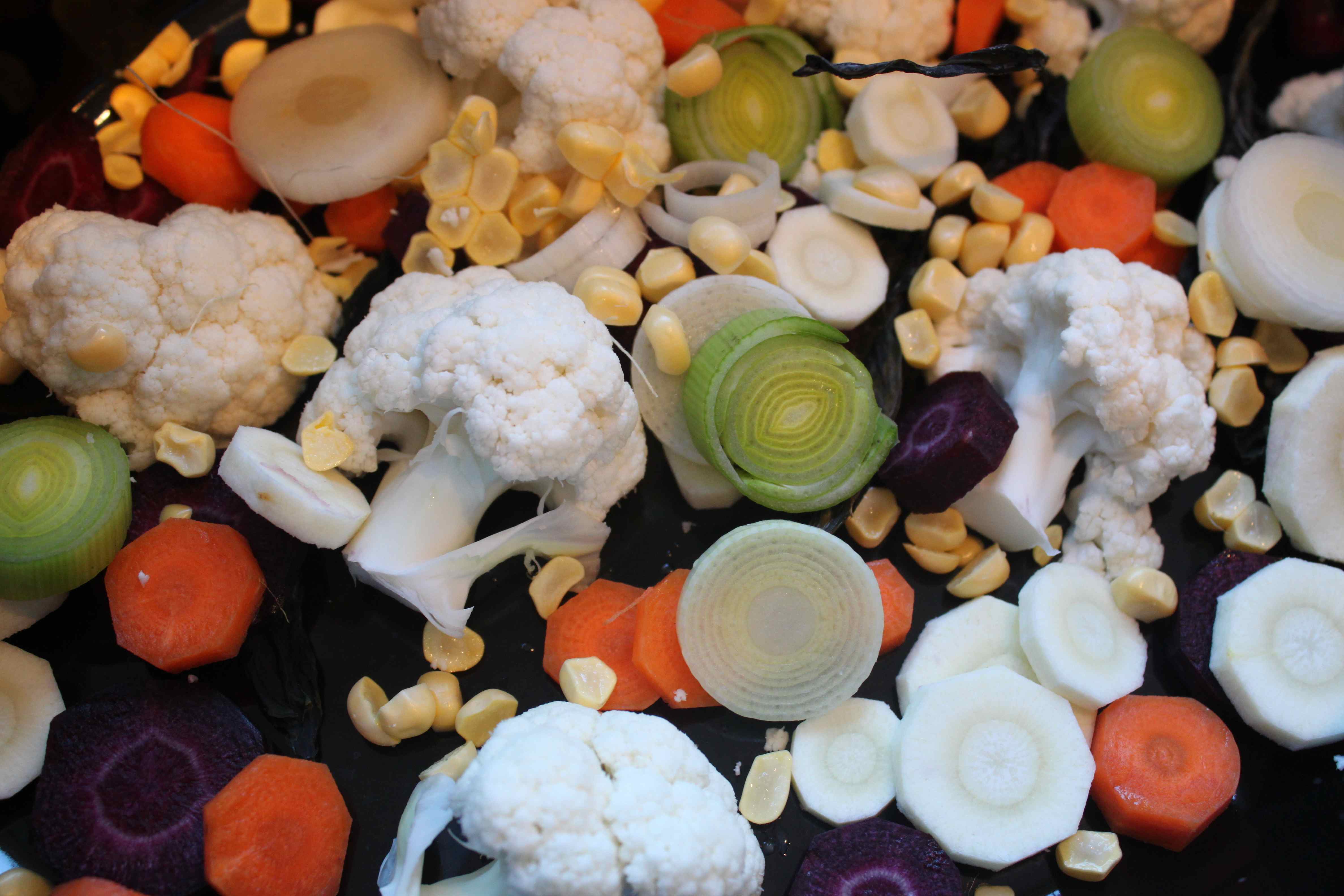 I added 1 purple carrot, 2 small orange carrots, about 1/3 head of cauliflower, 2 leeks, the kernels from 1 corn cob, 1 parsnip and some wakame.