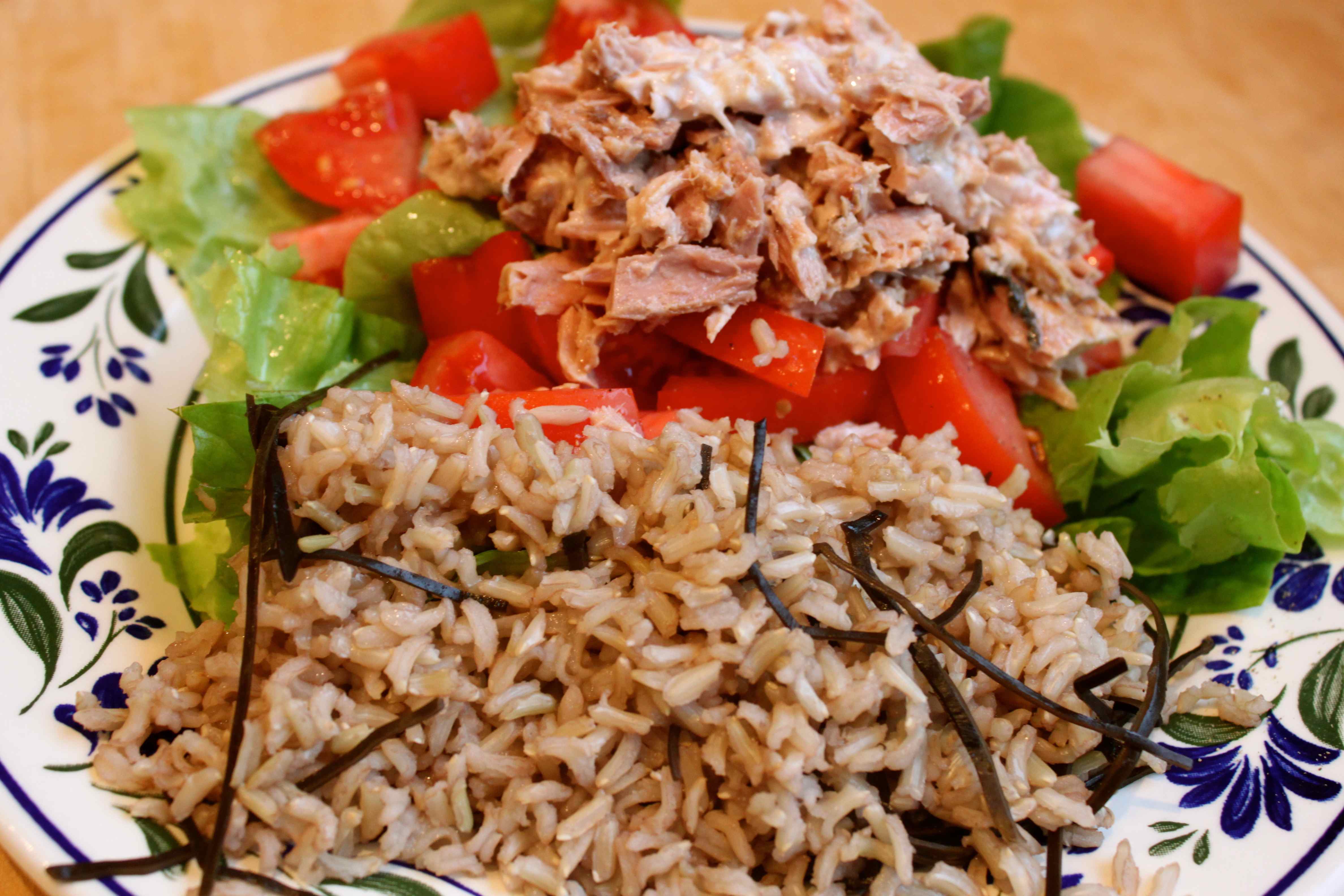 1 can of tuna (6) with 1 tbsp mayonnaise (3) plus 100 g brown rice (4) cooked with Arame seaweed.