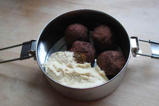 With some sweet potato falafel (which I bought in Waitrose and it was delicious) and hummus, in a silver dish.
