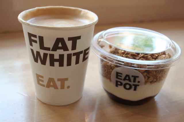 Flat white and a small pot of yogurt, granola and fruit compote for breakfast.