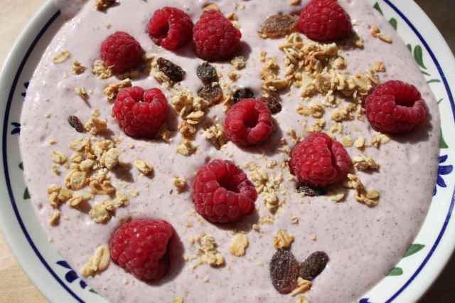 9:15 am, Strawberry Cheesecake Dough Boy Smoothie with raspberries and granola